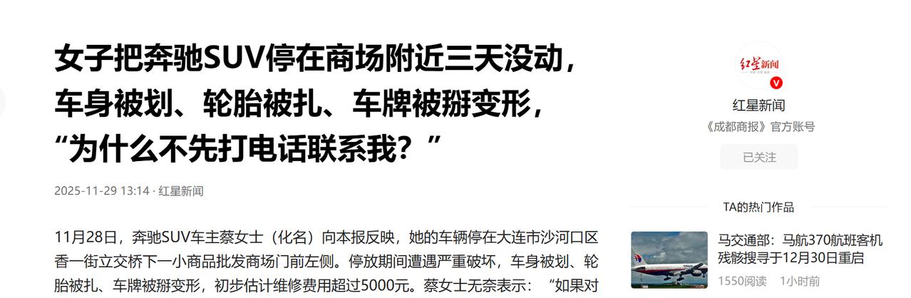 辽宁大连,女子把奔驰车停在一商场附近,3天没动,期间交警联系她,说有商铺要求她挪车,女子因有病在身,没立马挪,谁料等她去取车时,竟发现车被人损坏得面目全非,不仅车身被划、轮胎被扎,车牌也被掰变形,光维修费就得5000往上,女子崩溃质问:真着急为啥不打电话联系我,要背后下黑手? 蔡女士有一辆银灰色的奔驰 SUV,11 月 11 日晚上,她像往常一样把车停在了批发市场附近一个常停的空位上,车子左侧紧挨着过道,既没堵着哪家商铺的门脸,也留足了行人通行的空间,按理说没碍着任何人的事。 可她刚回到家身体就突然出了状况,高烧加上浑身无力,让她只能卧床休养,这辆奔驰车也就只能孤零零地在立交桥下的冷风里停了下来,这一放就是整整三天。 直到 13 日下午,一通交警的电话打破了蔡女士的休养,电话里交警说有周边商铺反映她的车碍事,催着她尽快过来挪车。当时蔡女士连说话的力气都不足,嗓子哑得厉害,她赶紧跟交警解释了自己生病的情况,说等稍微缓过劲儿就立刻去挪车,本以为这事能暂时缓一缓,可她怎么也没料到,有些人的耐心连这最后一晚都等不了,甚至连她贴在前挡风玻璃显眼位置、字体很大的挪车电话都懒得拨一下。 等蔡女士身体稍好,拖着病体去取车时,眼前的景象让她瞬间心凉,好好的车已经被损坏得面目全非,先看车头,原本平整的车牌被人用蛮力硬生生向上掰折,翘起了六十度的角,模样扭曲得格外刺眼,就连固定车牌的两枚带品牌标识的防盗扣也不翼而飞,明显是带着怨气的刻意破坏。 绕到车身右侧,情况更是触目惊心,两道将近两米长的划痕横亘在前后车门之间,深的地方已经露出了底漆,银灰色的车漆上这两道黑色 “伤口” 显得格外狰狞,绝不是路边树枝无意剐蹭能造成的。 更让她心疼的是,右后轮已经完全瘪了下去,仔细一看,一枚四棱三角钉精准地扎在了轮胎受力点上,这种特殊的钉子和扎入的位置,直接让这条防爆胎彻底报废,只能花钱更换。 看着被糟蹋得不成样子的车,蔡女士又气又崩溃,她实在想不通,真要是着急让挪车,明明有现成的挪车电话,打个电话沟通一下就能解决的事,为什么非要用这种背后下黑手的方式报复。 她去修车行问了价格,全车两米划痕的补漆、更换昂贵的防爆胎、修复钣金和车牌,再加上各项工时费,起步就得五千多块,这还没算上车辆经过剐蹭和拆修后,作为二手车必然会出现的残值缩水,这笔损失让本就生病的她雪上加霜。 而这笔五千多元的维修费,也直接触碰到了法律的红线,按照现行法律规定,故意毁坏公私财物如果造成的损失数额较大,性质就会从简单的民事纠纷升级为刑事案件,那枚扎进轮胎的四棱钉,划破的不只是汽车橡胶,更是商铺一方处理邻里矛盾的法律底线。 蔡女士当即报了警,辖区民警很快就调取了立交桥周边的监控录像,那些在暗处对车辆动手的 “黑手” 很快就要现出原形,谁也没想到,原本只是一件简单的占道挪车小事,就因为施暴者的暴戾和缺乏基本的沟通意识,硬是搞成了一桩可能要背负刑事责任还要支付巨额赔偿的麻烦事。 用五千多块的维修费去换那几分钟的 “解气”,这笔账,想必此刻施暴者正在心里反复盘算,只是再怎么算,也已经无法挽回自己冲动犯下的错,而蔡女士那句 “真着急为啥不打电话,非要下黑手” 的质问,也成了这件事里最让人唏嘘的注脚。 (信息来源:红星新闻——女子把奔驰SUV停在商场附近三天没动,车身被划、轮胎被扎、车牌被掰变形,“为什么不先打电话联系我?”)