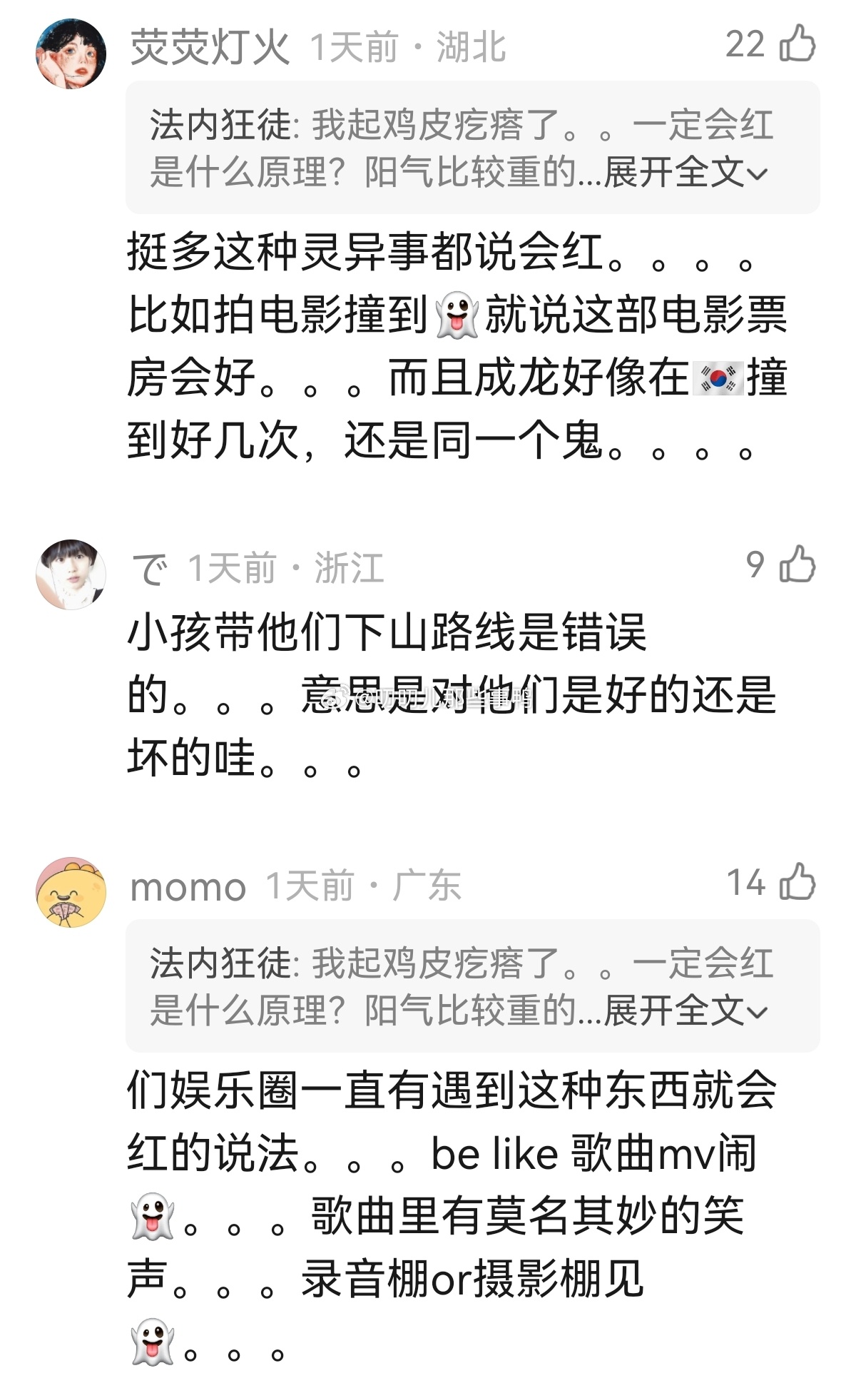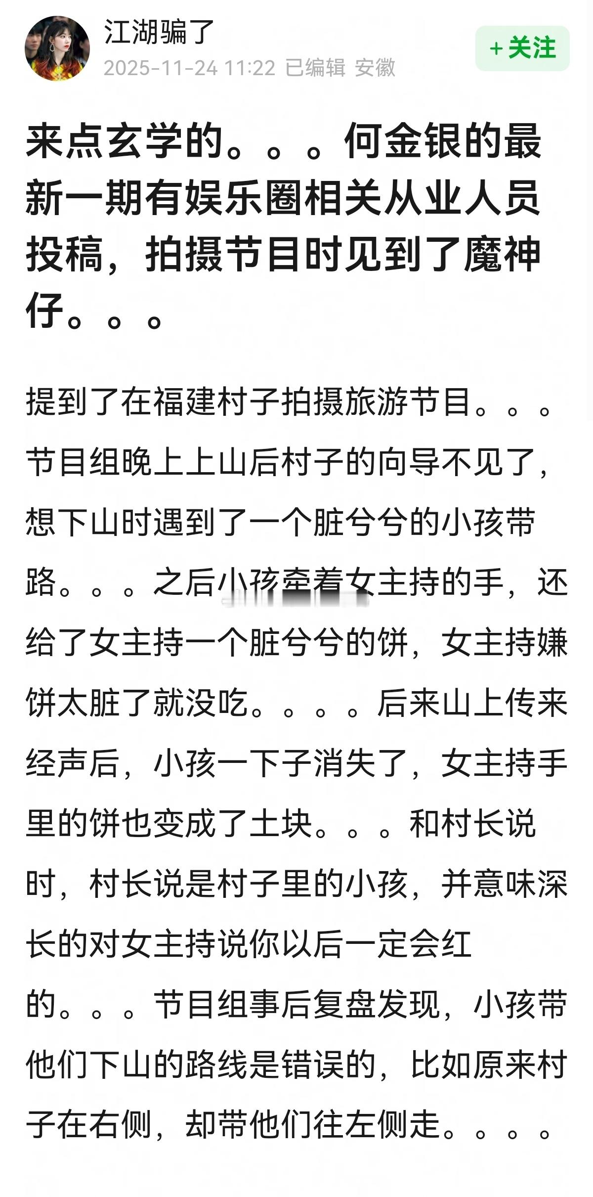这个好玄学啊→何金银的最新一期有娱乐圈相关从业人员投稿,拍摄节目时见到了魔神仔(图四b站的视频封面太吓人了,我打码了猫咪头像,感兴趣的可以去看看)