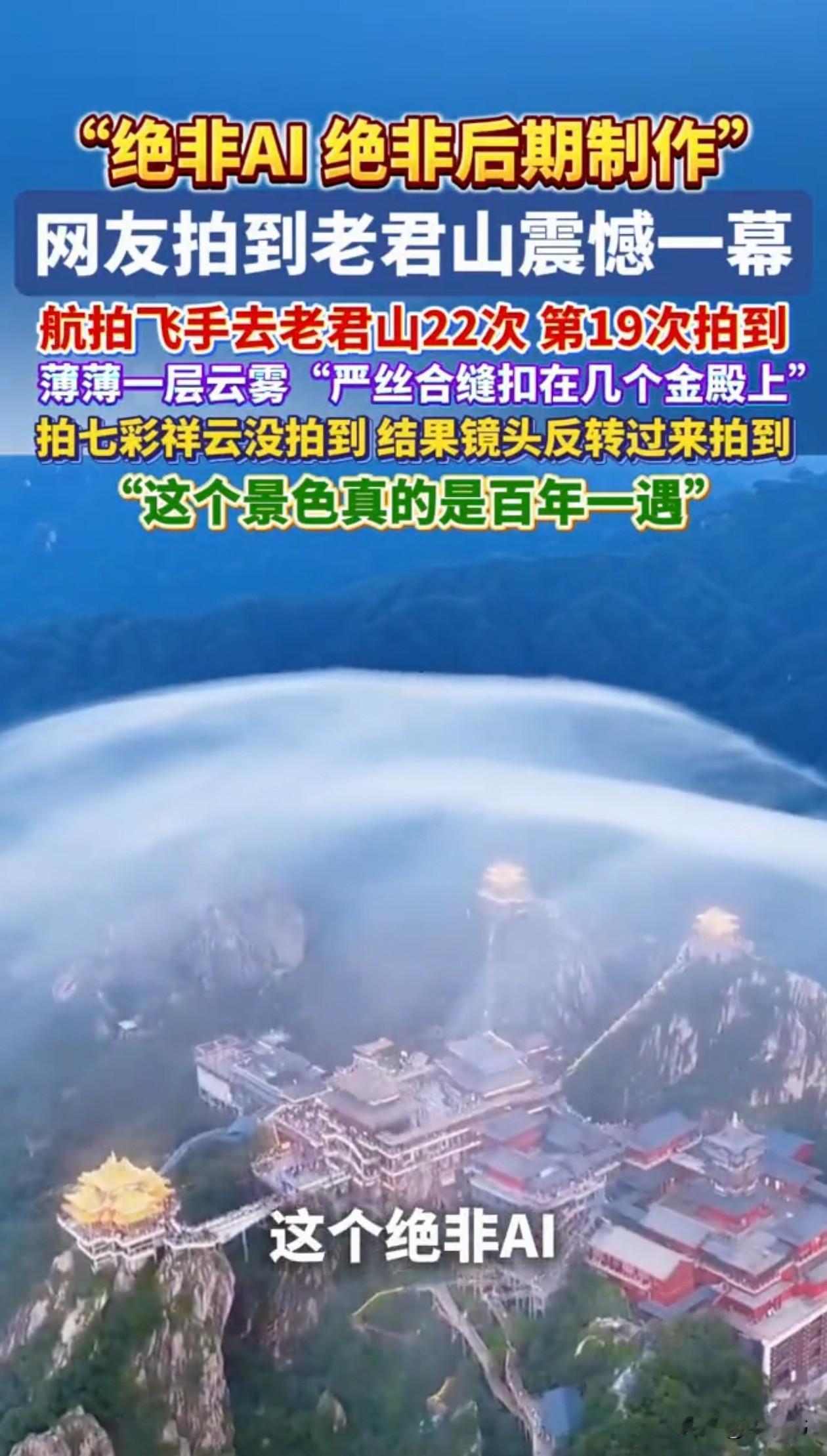 百年一遇!河南老君山,男子想去拍七彩祥云,结果却拍到了另一种奇观,一团云雾就像罩子一样,把老君山的几个金殿都扣在了里面。网友:“莫非这就是护山大阵?” 男子是个摄影爱好者,他知道老君山海拔高,登上去之后常常能看到一些神奇的惊喜,尤其是七彩祥云,他想拍很久了。 为此,他前前后后去了老君山22次,可惜一次都没拍到。但让他没想到的是,在第19次去老君山的时候,他竟然航拍到了一种奇观。 当时天上有一团云雾就像是被人操控了一样,直接围住了山顶的几个大殿。从上空俯视下去,就像有一个白色的大罩子,把这些宫殿护在里面,免受外界的侵扰。 他觉得这一幕很好看,很奇特,所以就把自己拍到的内容发到了网上,没想到网友们都看呆了。 有网友说:“这简直就是修仙小说照进现实啊!” 也有网友说:“这运气太好了,真的是难得能见一次的奇景。” 还有人质疑男子,认为他是拿AI做的视频,男子听到后觉得非常冤枉,因为这都是他实地拍摄的。 其实这种景观是有科学依据的,它有一个学名,叫做“云瀑”或者“地形云”。 原理也很简单,老君山的顶端就像个帽子一样,所以气流就跟着往上跑。如果遇到下雨,水汽充足,温差再一大,水汽就会凝结成雾,在风的吹动下往山上去。 这时候再来点眼光一照,那看过去就是金光闪闪的“护山大阵”了。所以这不是什么修仙小说,而是物理游戏。