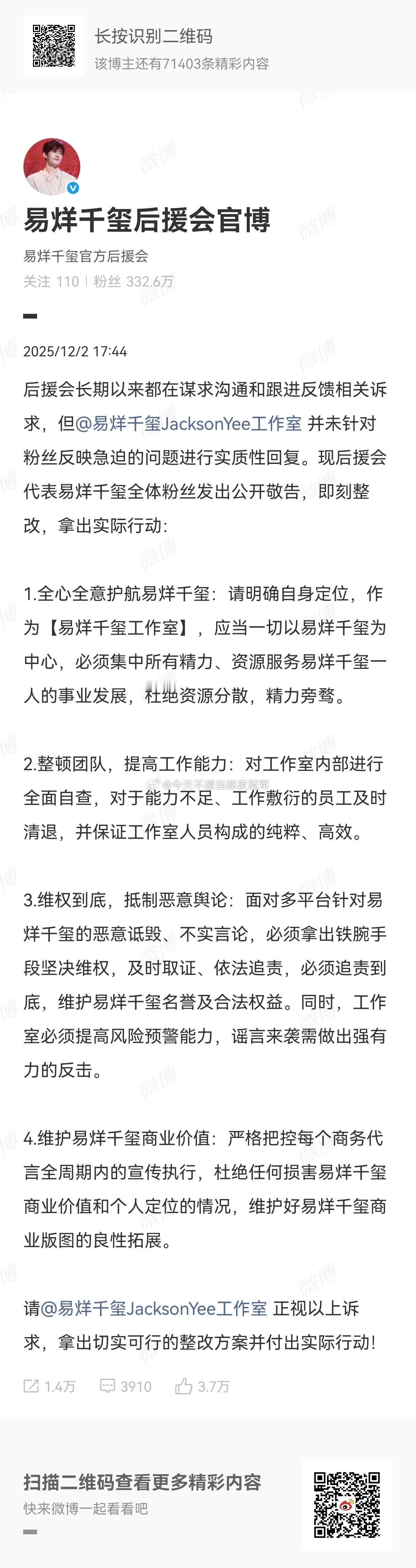 tg. 易烊千玺粉丝向工作室维⭕,要求gzs做出以下整改易烊千玺文淇 经纪人