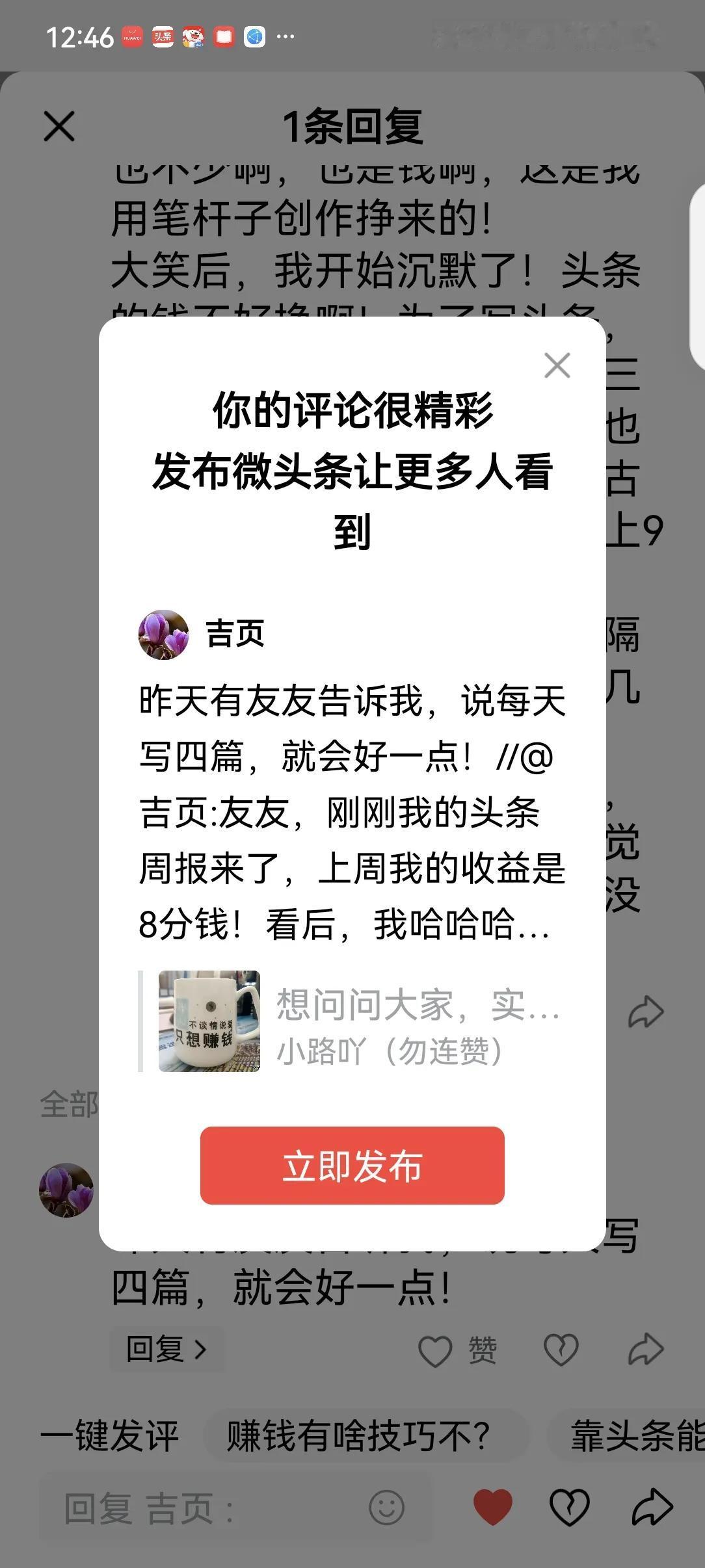 今天主要夸夸我的一个粉丝 我有一个粉丝,名字叫吉页,是一个新人,她特别勤奋,她每次阅读完我的作品,写的评论都很精彩,我特别喜欢她。 我看了她的主页,查了她一天所发的作品,不查不知道,一查吓一跳,好家伙,一天整整发了50个作品,大部分都是给别人的评论精彩发出去的。 我问她发这么多干啥,太辛苦了,她说,这是头条让发的,每一次评论,头条都出现精彩评论,都会出现立即发布。这个好友不敢不发,所以,每天特别忙,光这50篇作品的评论都回不及,累也不怕,主要还没有一分钱的收益。 我非常同情她,就在评论区里给她说,让她少发点作品,一天发3到4篇,把每一天写好,这样就有阅读量了。 友友听了我的劝说,她不再一天发50个作品,今天我又去看了她的主页,她发了4个作品,比以前少多了,这样她也不太累了,也能把每篇作品写好。 这个网友特别热心,她所阅读过的作品,都是评论很精彩,她是非常认真的,是一个值得结交的网友。 如果大家看到一个叫吉页的网名,可以关注一下,她人很好,保证回关,她还是个礼尚往来的好友,不会让你们失望。