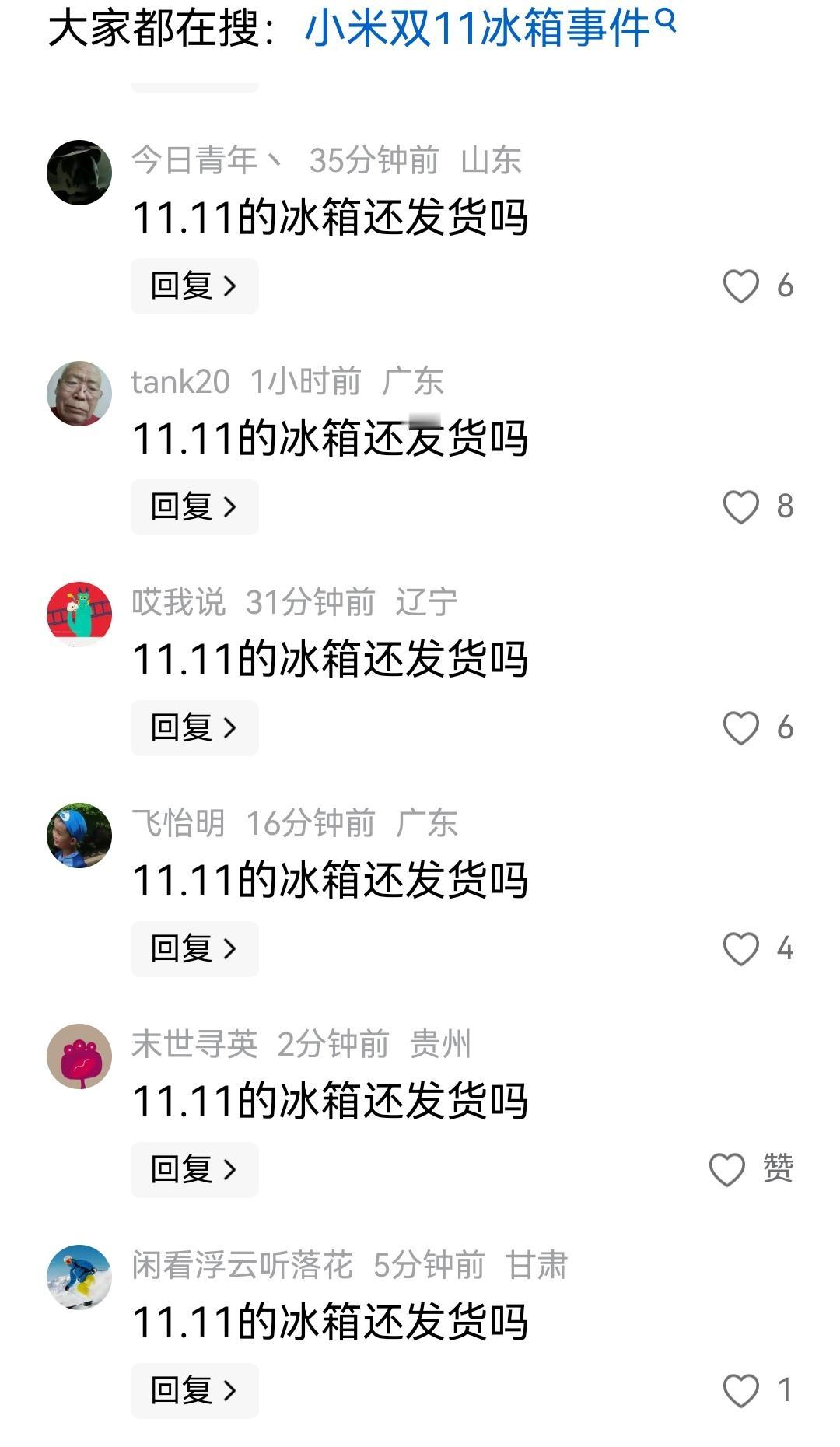 雷总的号发了一篇“小米汽车累计交付50万辆,感谢每一位车主的选择和信任”结果网友不干了,大家去看看评论区,全是11.11冰箱还发不发货,就连拓展搜索都是的,不知道这个雷总能不能看到。要我说还是限制评论吧,咱一直宣传好处,这个问题是不是应该回应一下。