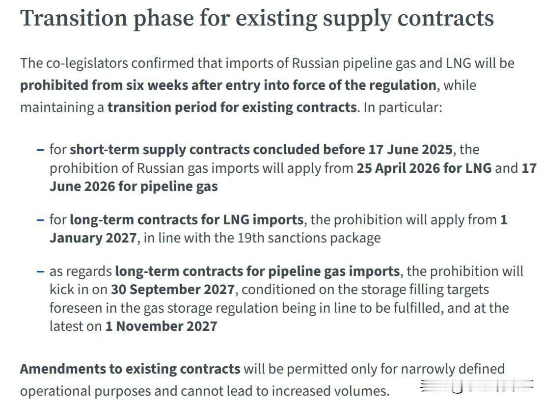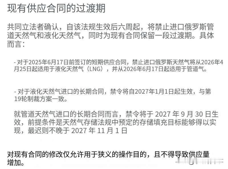 🇪🇺🇷🇺欧盟批准了到2027年完全停止进口俄罗斯天然气的计划。 ▪️根据欧洲理事会和欧洲议会的决定,管道天然气供应应不晚于2027年9月30日停止,个别情况下甚至可能提前至2027年11月1日。 ▪️对于现有合同,设有过渡期。 ▪️对于在2025年6月17日前签署的短期合同,禁令将提前生效:液化天然气从2026年4月25日起,管道天然气从2026年6月17日起。 欧盟天然气禁令 欧盟天然气供应 俄欧天然气管道 天然气 欧洲天然气储备