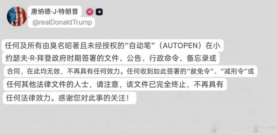 特朗普宣布所有拜登签署的文件全部作废,理由是使用了自动签名笔。