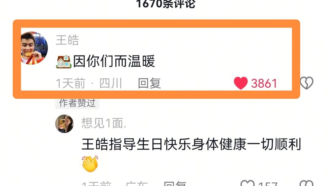 “皓哥生日快乐,皓哥(他爸)谢谢你每次把仅有的休息时间都留给我和孩子,谢谢你引领和陪伴我们共同成长,生日快乐、一切顺利我们在家等你[心]” 12月1日是国乒男队主教练王皓的生日,因为成都混合团体世界正在进行,所以王皓的爱人带领两个孩子给王皓指导特意制作了一个视频,祝福王皓指导生日快乐,这个视频是王皓爱人闫博雅特意制作的,非常温暖的一条视频。 视频里有王皓指导在家给小儿子海螺剪胶皮的画面、也有王皓指导陪伴大儿子海苔外出打比赛,还有王皓指导跟大儿子视频的画面,小儿子海螺为了准备他爸爸的生日礼物,花完了最后的压岁钱,海螺真的太可爱了。 王皓指导做了多年男队教练,现在又是两个孩子的父亲,从他的话语里,可以感受到他对儿子的教育是全方位的,分享一段王皓指跟他大儿子视频聊天的内容。 “体育精神就是不断地超越自我,它的意义不仅仅是去夺得冠军,而是每一次坚持不懈,不放弃,尤其是在你付出很多汗水的时候,我相信,它的最后的结果是不会撒谎的,爸爸相信,体育给你带来的不仅仅是更多提升临场发挥的能力,还有在任何时候面对困难挑战的勇气。” 王皓指导说,🏠因你们而温暖。
