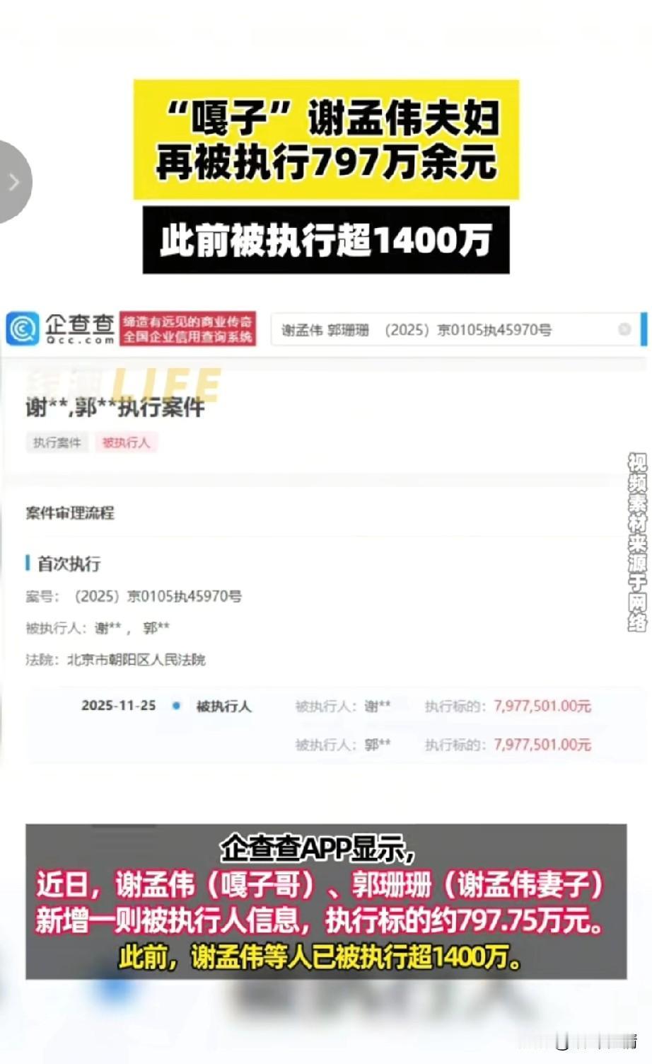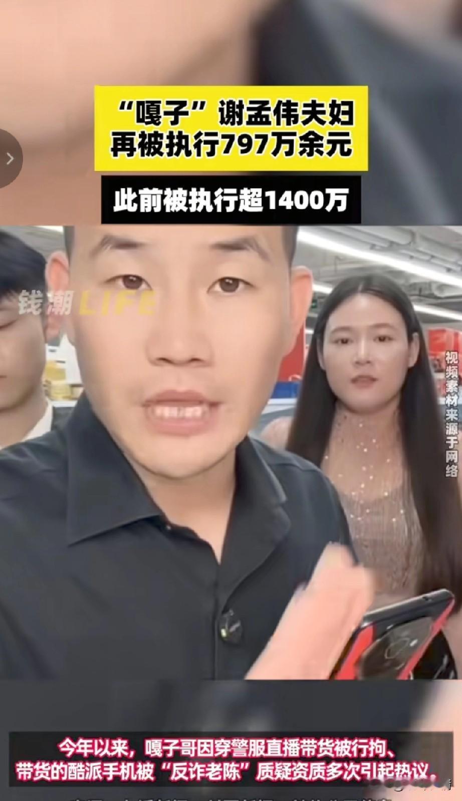 嘎子哥,谢孟伟夫妇再次登上热搜, 既然是要被法院再次执行797万余元, 之前被执