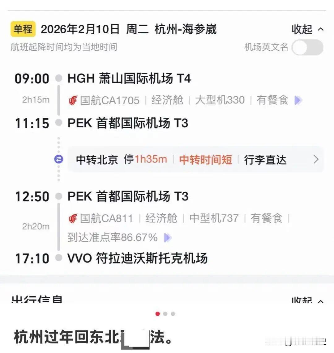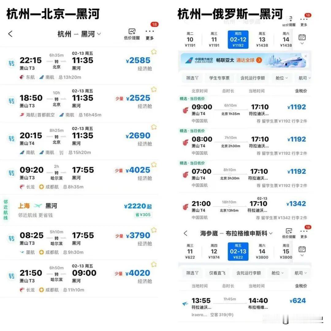 俄对华免签催热“曲线跨国返乡攻略”:从杭州取道俄罗斯再回东北过年,竟比国内便宜1000元。[嘘] 俄罗斯对中国公民实行免签政策之后,一些旅客在规划行程时发现了新的可能性,特别是在南方城市和东北地区之间往返的旅客中,有人开始尝试通过俄罗斯中转的路线,因为这有时比国内直飞更划算。 举个例子,从杭州到黑龙江黑河,如果选择在二零二六年春节期间直飞,票价大约在两千五百元左右,但有旅客发现,另一条路线是先飞往俄罗斯的符拉迪沃斯托克,然后再通过陆路或水路,经布拉戈维申斯克进入黑河,整个行程的总花费大概是一千七百元,能节省八百元左右。 一些网友在社交平台上分享了他们类似的行程规划,比如从杭州飞到符拉迪沃斯托克后,再转往黑河或牡丹江等东北城市,这种需要出入境两次的跨国路线,为旅客提供了另一种选择。 外交部发言人近日在回应相关问题时表示,中俄互免签证安排有利于促进两国之间的人员往来和各领域合作,当然,选择这类路线也需要注意,整个行程所花费的时间通常会比直飞更长,并且需要办理两次出入境手续。 计划尝试的旅客最好提前了解清楚相关的出入境政策和交通衔接,合理安排时间,同时也要注意俄罗斯远东地区和中国东北在气候上的差异,准备好相应的衣物。 一则关于“借道俄罗斯回国更省钱”的出行攻略在网络上引发热议,不少网友围绕这种新型出行方式的可行性、性价比以及背后的政策红利展开了广泛讨论。 “这届网友真是把出行攻略研究明白了!” “虽然能省近千元,但中转环节多,适合时间充裕的年轻人。” “免签确实方便,说走就走的跨国旅行变得更简单了。” “跨国中转需要考虑语言沟通、汇率兑换等因素,不适合所有人群。” 这波讨论反映出,在全球化背景下,人们的出行方式正变得更加多元和灵活,您会考虑尝试这种跨国中转的出行方式吗?在规划旅行时,您最看重哪些因素?欢迎分享您的经验和看法! 信息来源:极目新闻