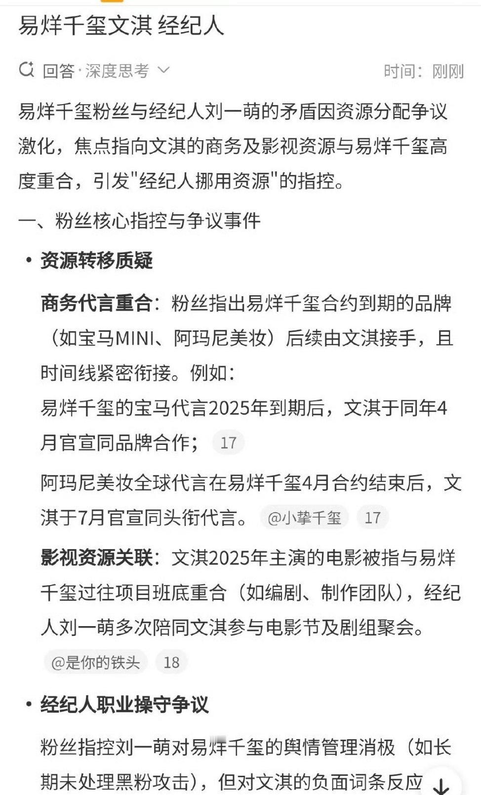好像说易烊千玺和文淇资源有重合,因为是同一个经纪人不过我有点疑问,这个接手是同抬头接手还是只是合作了,但抬头没这么高了?为什么经纪人不让四字继续代言反而给文淇了,照理说四字才拿了金鸡,品牌方居然转向文淇?易烊千玺文淇 经纪人