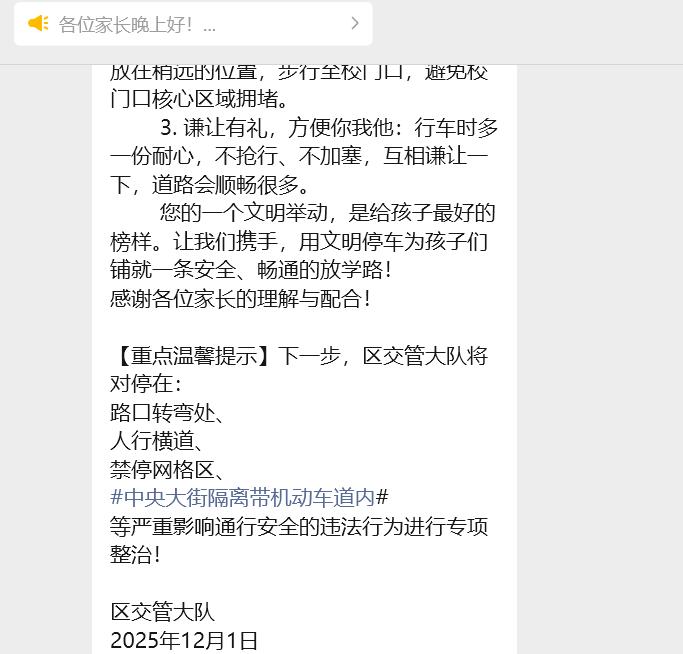 为爱让行!苏家屯沈水7中校门口违停将专项整治,给孩子一条安全回家路! 放学铃响,校门口的 “接娃大军” 却常变 “堵局”—— 中央大街隔离带一车道被违停车占据,路口转弯处、人行横道上不时出现 “路中岛”,车流交织间,孩子穿梭的身影藏着不小风险。 这份急切我们懂,但乱停不仅耽误时间,更可能引发 “鬼探头” 事故或追尾剐蹭。家长的方向盘,藏着孩子的安全线,文明停车就是最好的言传身教! 在此倡议:临时停靠请 “即停即走”,让孩子快速上下车;不妨多走几步,将车停到远端车位步行接送;行车时多份耐心,不抢行加塞。 划重点!区交管大队已启动专项整治,路口转弯处、禁停网格区、中央大街隔离带机动车道等区域的违停行为将从严处理。 畅通放学路,需要你我共守。用一次规范停车,为孩子铺就安全归途❤️ 文明停车护学岗