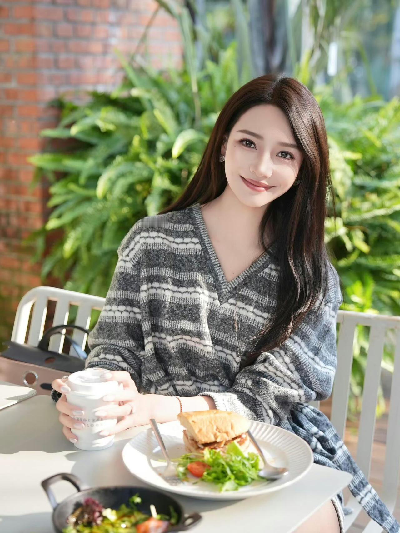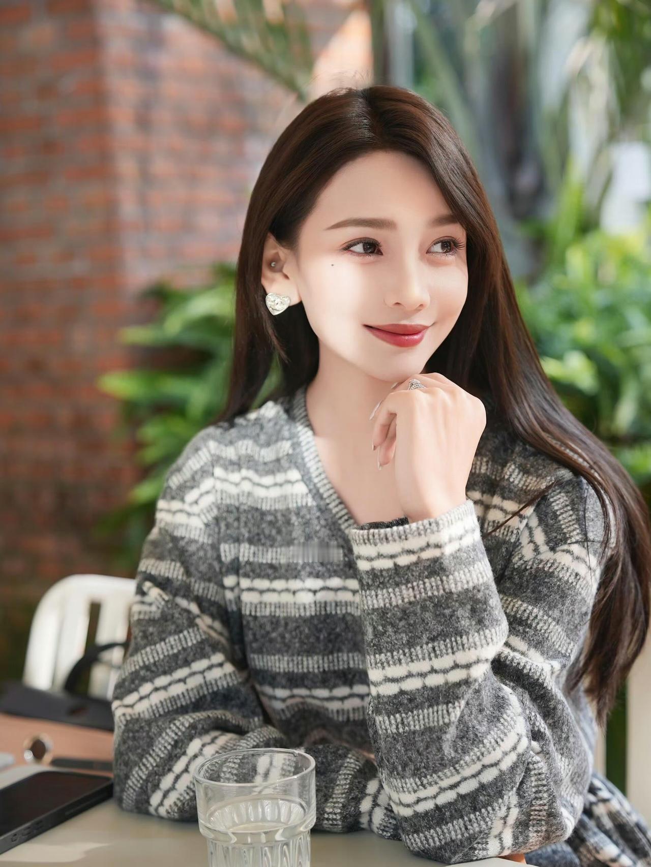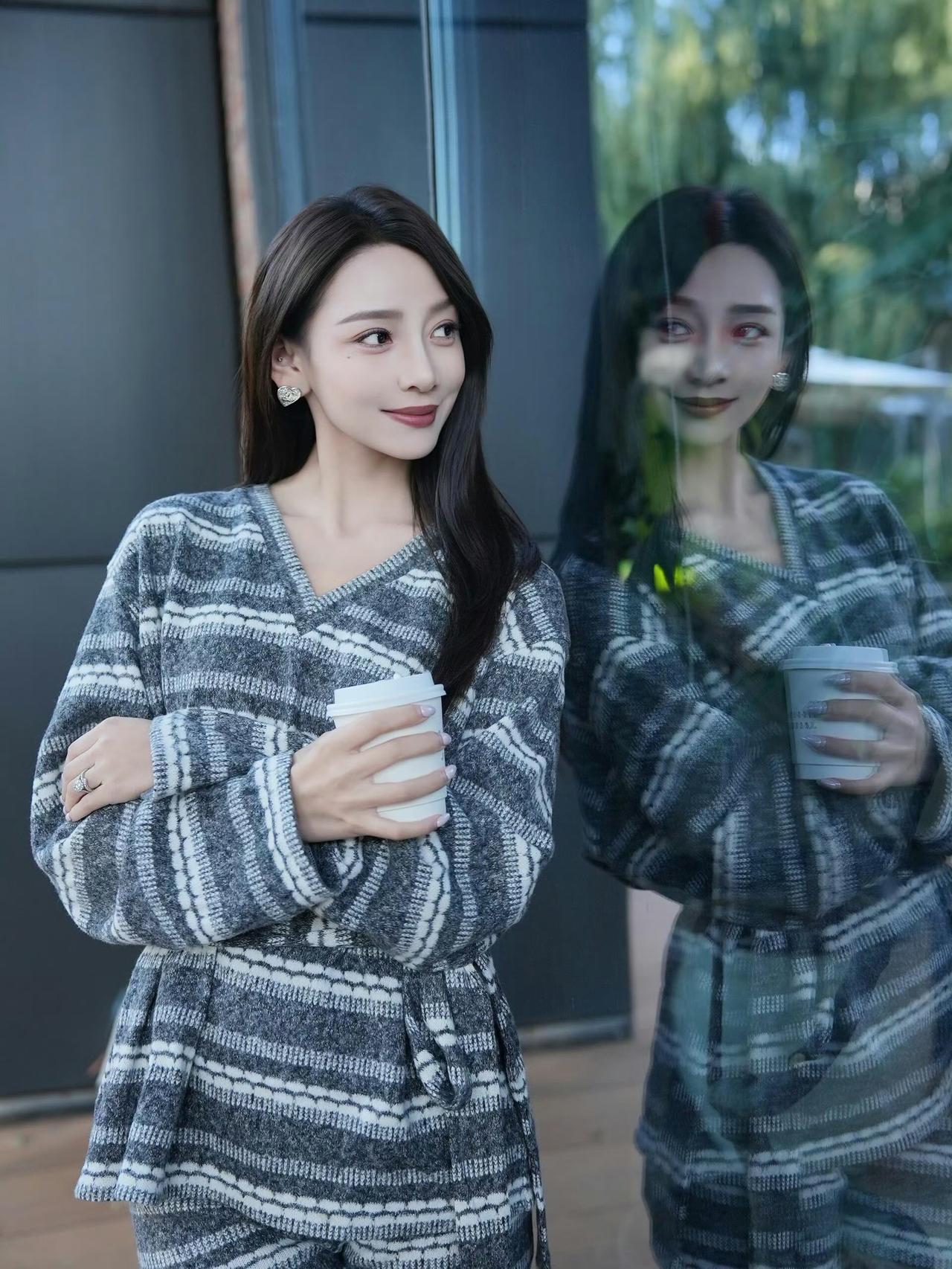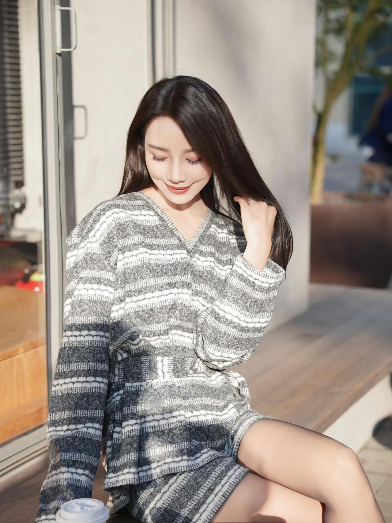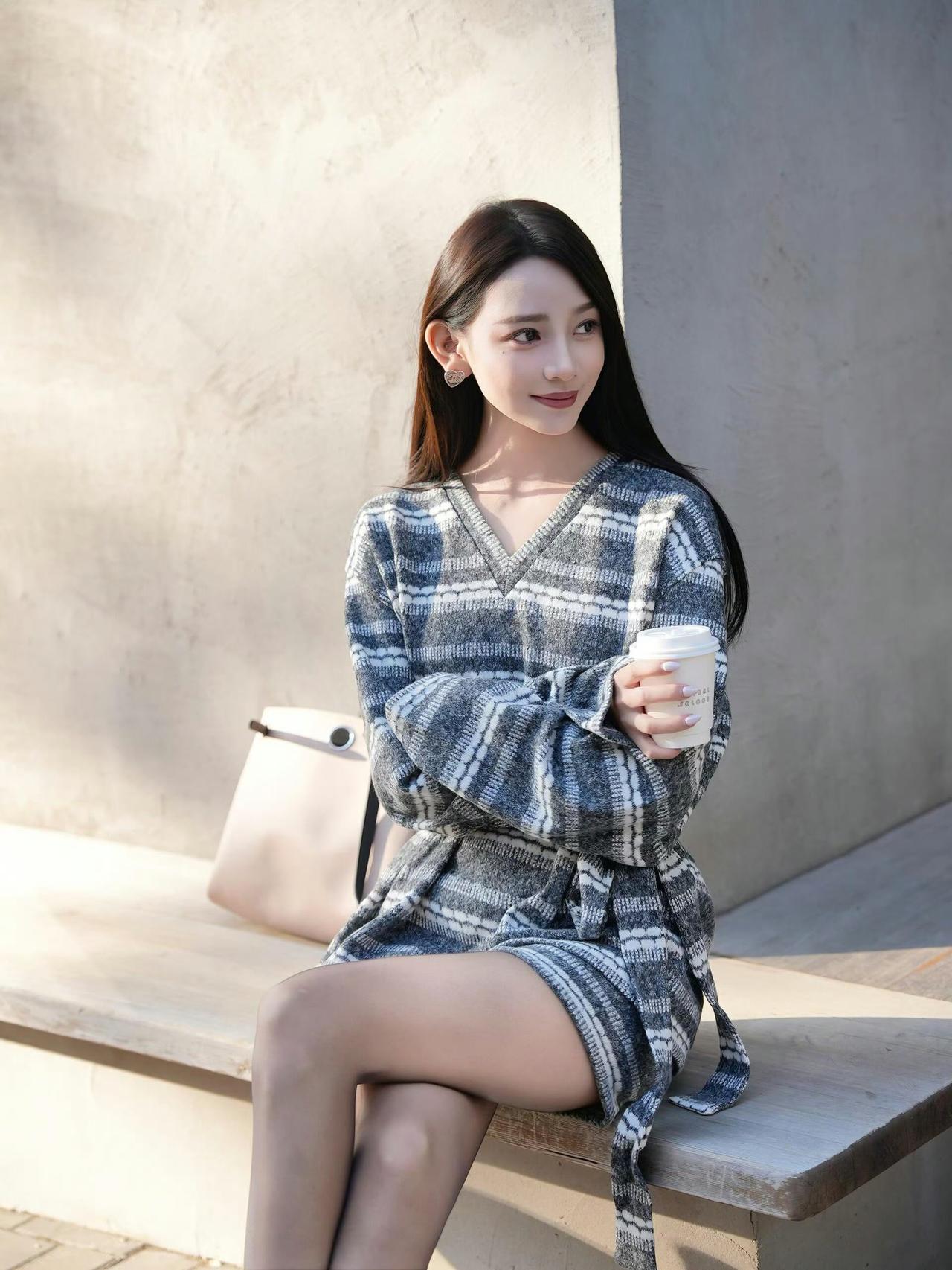 这套穿搭是温柔松弛的复古休闲风,舒适又具精致感。灰黑条纹针织连衣裙自带慵懒氛围,V领+收腰系带设计既显温柔又能修饰身形,短款版型搭配丝袜,平衡了休闲与轻熟感。 搭配浅蓝水钻单鞋精致亮眼,与连衣裙的低调形成对比,提升了造型的精致度;棕白拼色包简约实用,与整体松弛风格呼应,丰富了视觉层次。灰色针织裙
