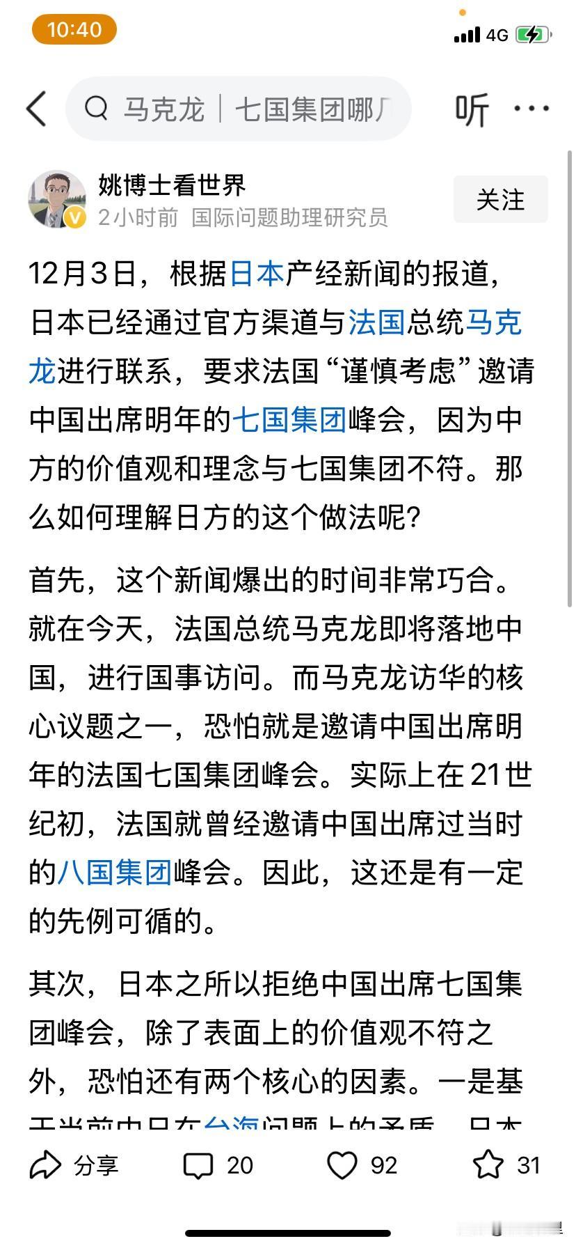 日本有点自作多情了,还不让法国邀请中国出席七国集团峰会,问题是法国即使邀请中国,中国也不会参加,中国对G2都没兴趣,还会参加G7吗?日本别自己给自己加戏了