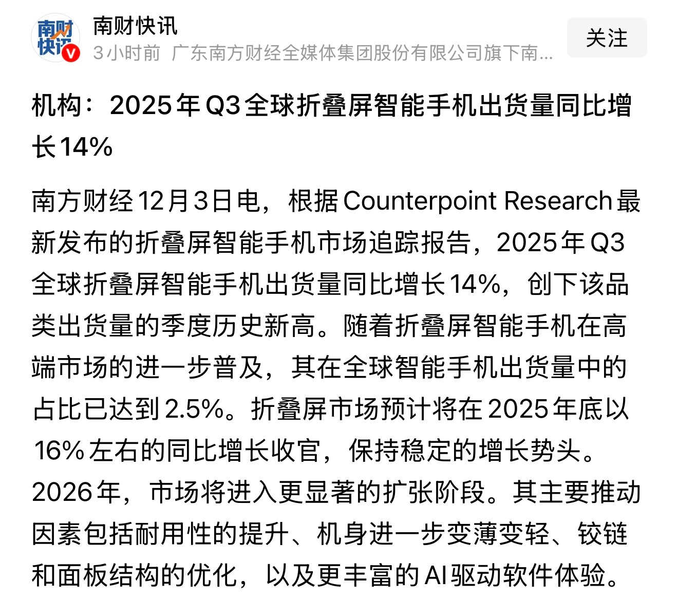 2025年Q3折叠屏手机出货量暴涨14%!这市场真的越来越火~ 现在不管是揣兜里的小折叠、办公用的大折叠,还是能掰出多种形态的三折叠,早就不是“花里胡哨的尝鲜款”了。华为、荣耀这些品牌都在发力,小折叠轻薄好带,补妆刷剧超方便;大折叠分屏办公、看报表贼利索;三折叠更是把大屏玩出花,多任务切换毫不费劲。现在折叠屏价格也越来越亲民,功能还越来越实用,你心里是不是也种草了?你更想买哪种形态?是冲便携的小折叠,还是奔着生产力的大折叠?来评论区聊聊~
