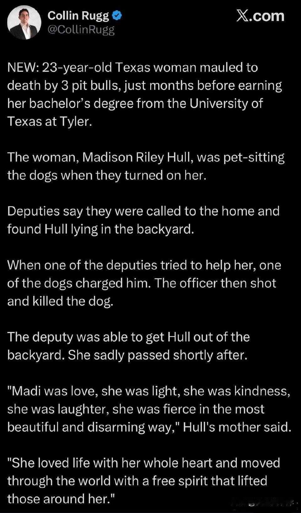 最新消息:一名23岁的得克萨斯州女性被3只比特犬袭击致死,而几个月后她本应从得克萨斯大学泰勒分校获得学士学位。 这名女性名叫Madison Riley Hull,当时正在帮人照看这些狗,结果它们突然对她发起攻击。 警方表示,他们接到报案后赶到现场,发现Hull躺在后院。当一名警员试图上前救助时,其中一只狗向他扑来,警员随即开枪将其击毙。 该警员成功将Hull从后院救出,但她不久后不幸去世。 “Madi就是爱,是光,是善良,是欢笑,她以最美丽、最令人卸下防备的方式充满力量,”Hull的母亲说道。“她全心全意地热爱生活,以自由的精神行走在世界上,感染并提升着身边的人。”