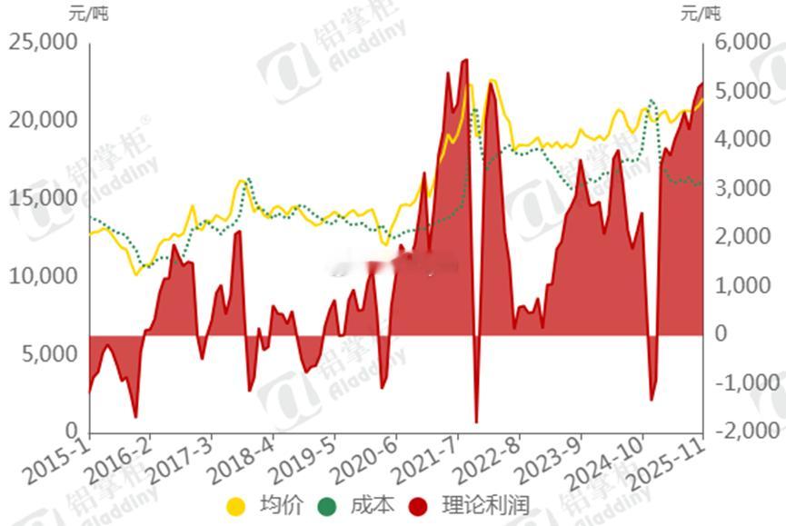 2025年中国电解铝行业利润将刷新历史纪录(来源:阿拉丁)阿拉丁(ALD)成本盈亏模型测算结果显示,2025年11月全国电解铝加权平均完全成本16300元/吨左右,环比增加382元/吨(原料价格使用采购周期内均价,并非即期价格)。按照阿拉丁华东A00铝锭11月份结算价格21435元/吨测算,当月全行业平均利润超5100元/吨,再创年内新高。2025年1-11月份,全国电解铝行业算术平均成本约16742元/吨,较去年同期下降638元/吨,同比降幅3.67%;同期铝价为20586元/吨,同比上涨682元/吨或3.43%。2025年1-11月份,中国电解铝行业平均利润约3844元/吨,同比增加1320元/吨或5.23%。以年度周期为基准,2025年中国电解铝行业利润将刷新历史纪录,对比成本降幅和铝价涨幅来看,全年行业利润走扩的主要贡献来自铝价上涨。沪铝期货