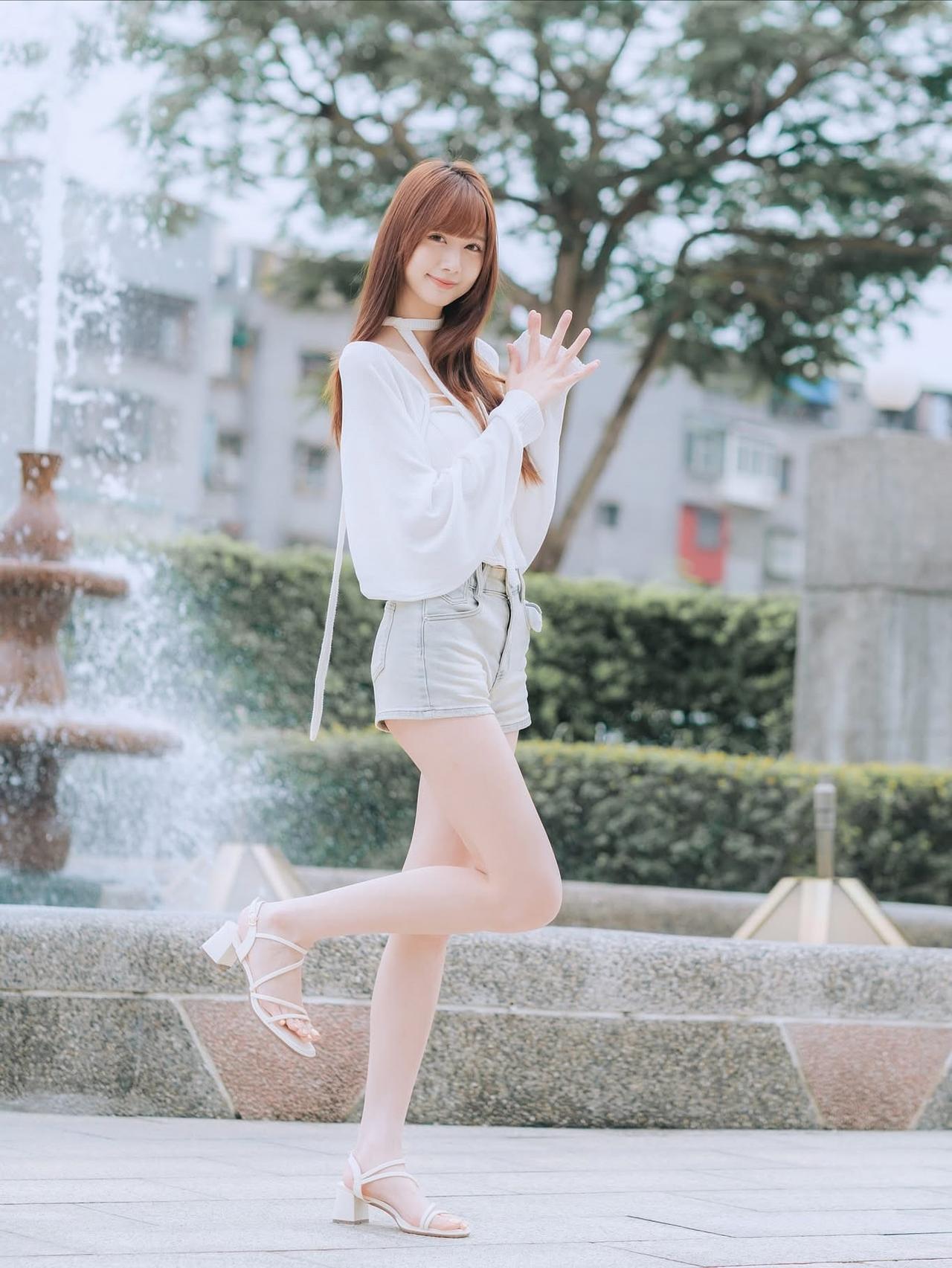 元气少女在喷泉边,萌宠发饰可爱满分!💖🌟女生怎么穿紧身裤才好看