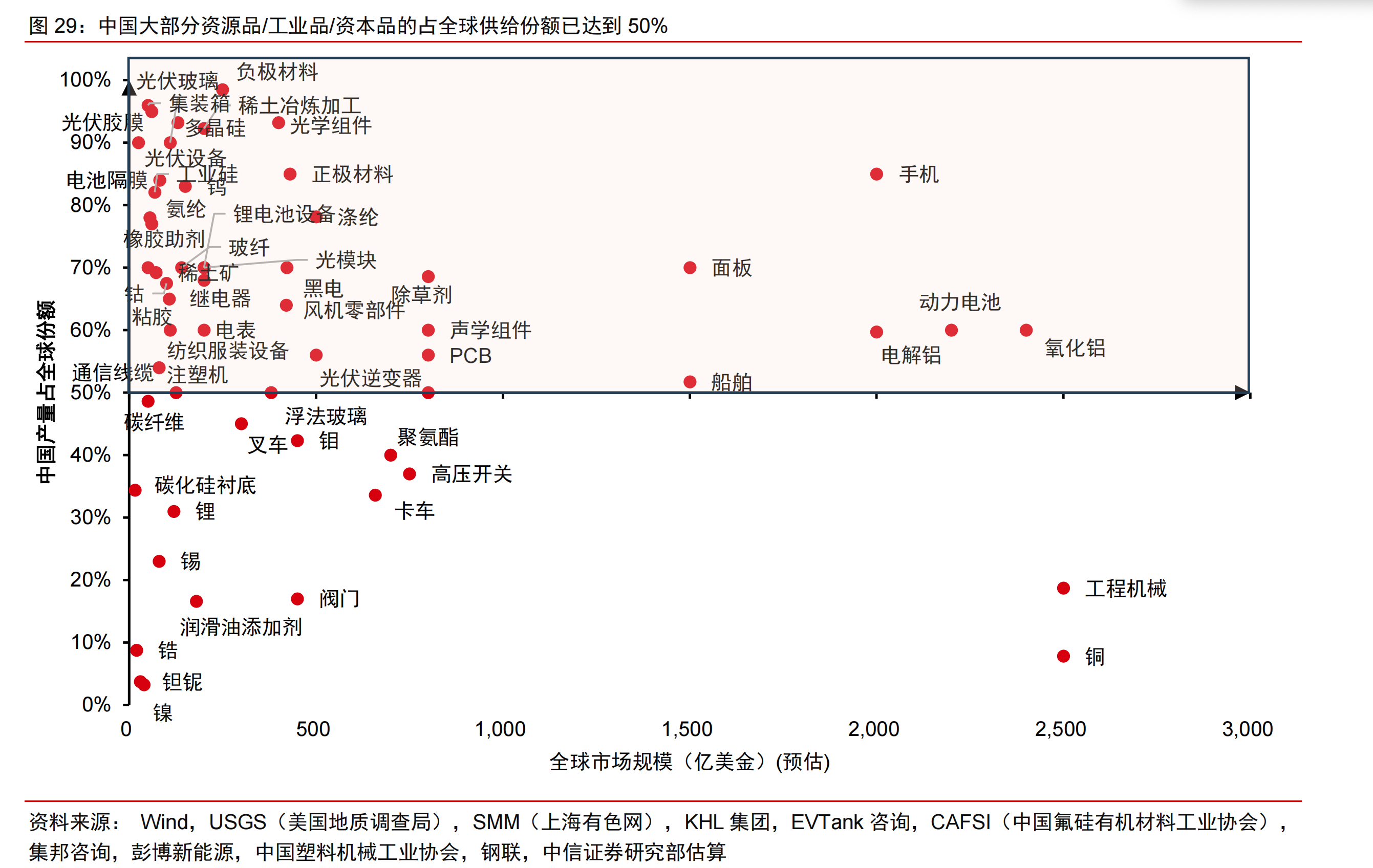 中信证券统计的83 个全球市场规模超过 100 亿美金的资源品/工业品/资本品的品种里,中国产量份额占比超过 50%的品种已经达到 51 个。