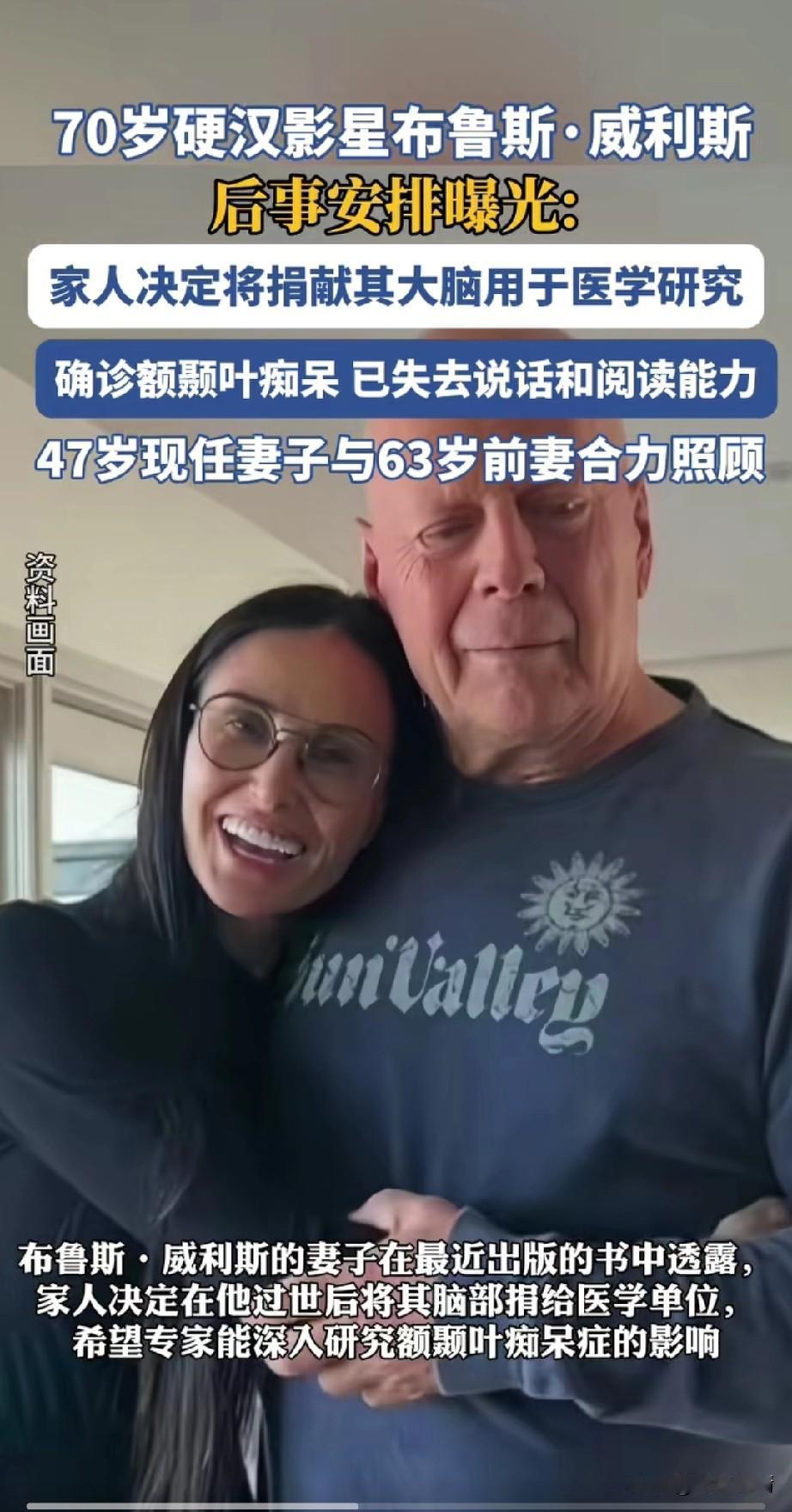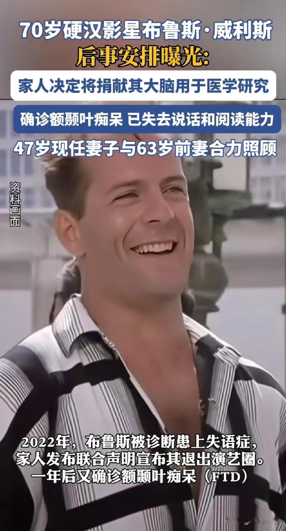 70岁硬汉影星布鲁斯.威利斯被确诊患了痴呆,之前他就被诊断出了失语症, 由47岁的现任妻子和63岁的前妻合力照顾,患病后他就退出了娱乐圈, 大家对于他年轻时候的风采都有所耳闻,毕竟他演过很多影片, 如今年龄大了也逃不过疾病的折磨, 他的身后事已经被安排, 家人决定捐献他的大脑作为医学研究, 这里的家人应该是现任妻子和前任妻子,这个决定还真是大胆, 他去世后两位妻子应该能获得不少遗产,健康才是第一位, 有钱也难买自己的健康, 才70岁的年纪就患了老年痴呆, 还真是人走了,钱还在! 大家对于这位硬汉影星的身后事怎么看? 痴呆老人 晚年痴呆症 失智症老人 布鲁斯·威利森 布鲁斯威尔斯