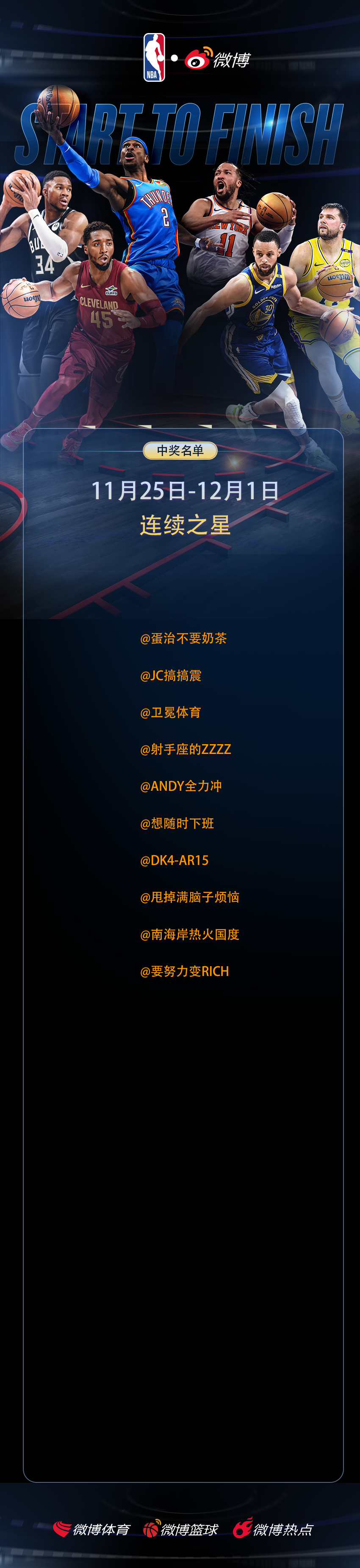「 NBA趣评分 」11月25日-12月1日“连续之星”中奖名单恭喜以下用户喜提8.8🧧每周连续评分≥5天,即可获得惊喜红包!参与方式:比赛日进入任意NBA球队超话,球员打分+10字评论,获得抽奖资格!NBA 活动激励将在活动结束后统一发放