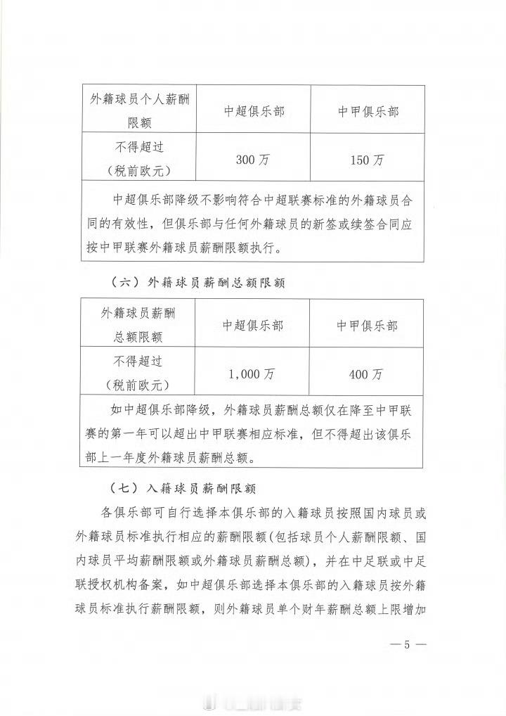 中超国内球员年薪封顶500万通知规定:国内球员年薪限额分别为500万(中超)、300万(中甲)和120万(中乙);国内球员平均薪酬分别为300万(中超)、150万(中甲)和50万(中乙)。中超球队联赛单场赢球奖金不得超过300万元