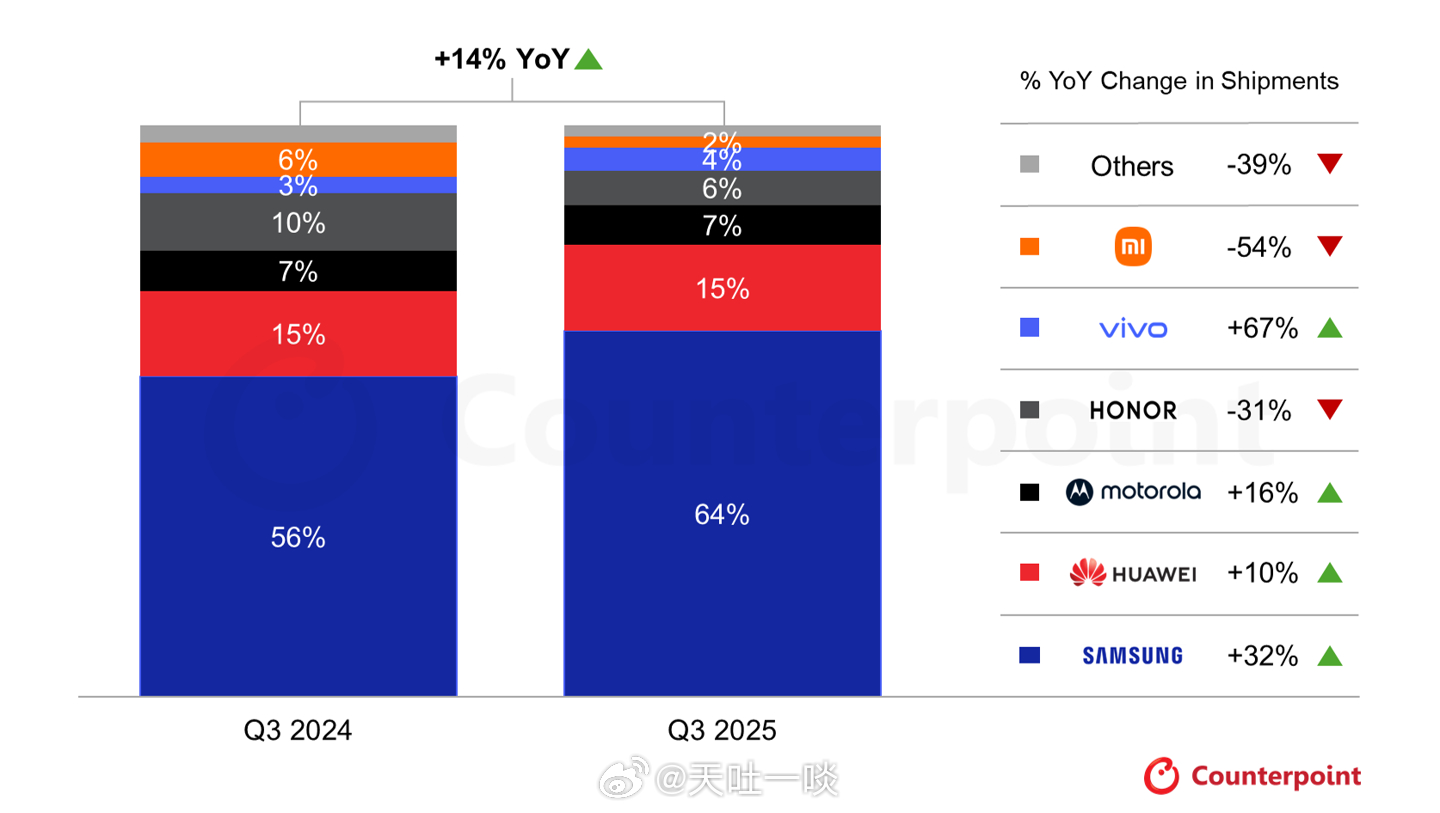 Q3全球折叠屏市场数据出炉,vivo增长量最大,小米下跌量最大1、Q3是全球折叠屏手机出货量最多的一季,但折叠屏手机依然小众。占比智能手机整体份额仅为2.5%;2、三星高居第一位,且市场份额超60%。华为第二,摩托罗拉第三,荣耀第四,vivo第五,小米第六,OPPO没上榜;3、三星、华为、摩托罗拉、vivo同比在增,其中vivo增量最大。荣耀、小米在跌,其中小米跌幅最大。PS:可以讲全球范围之内折叠屏看三星,国内市场看华为。其它品牌真的……三星首款三折叠手机发布
