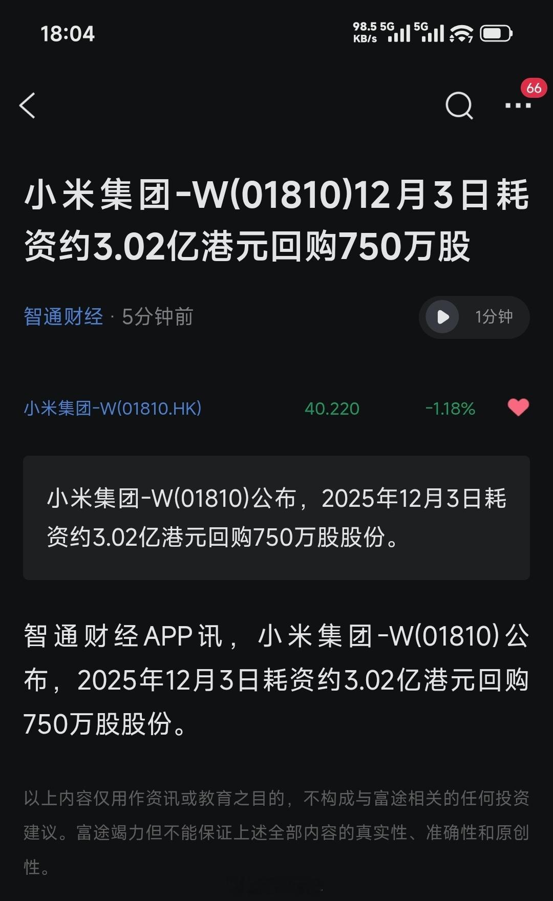 【米东快讯】今日回购 3 个亿 小米集团-W(01810)12月3日耗资约3.02亿港元回购750万股