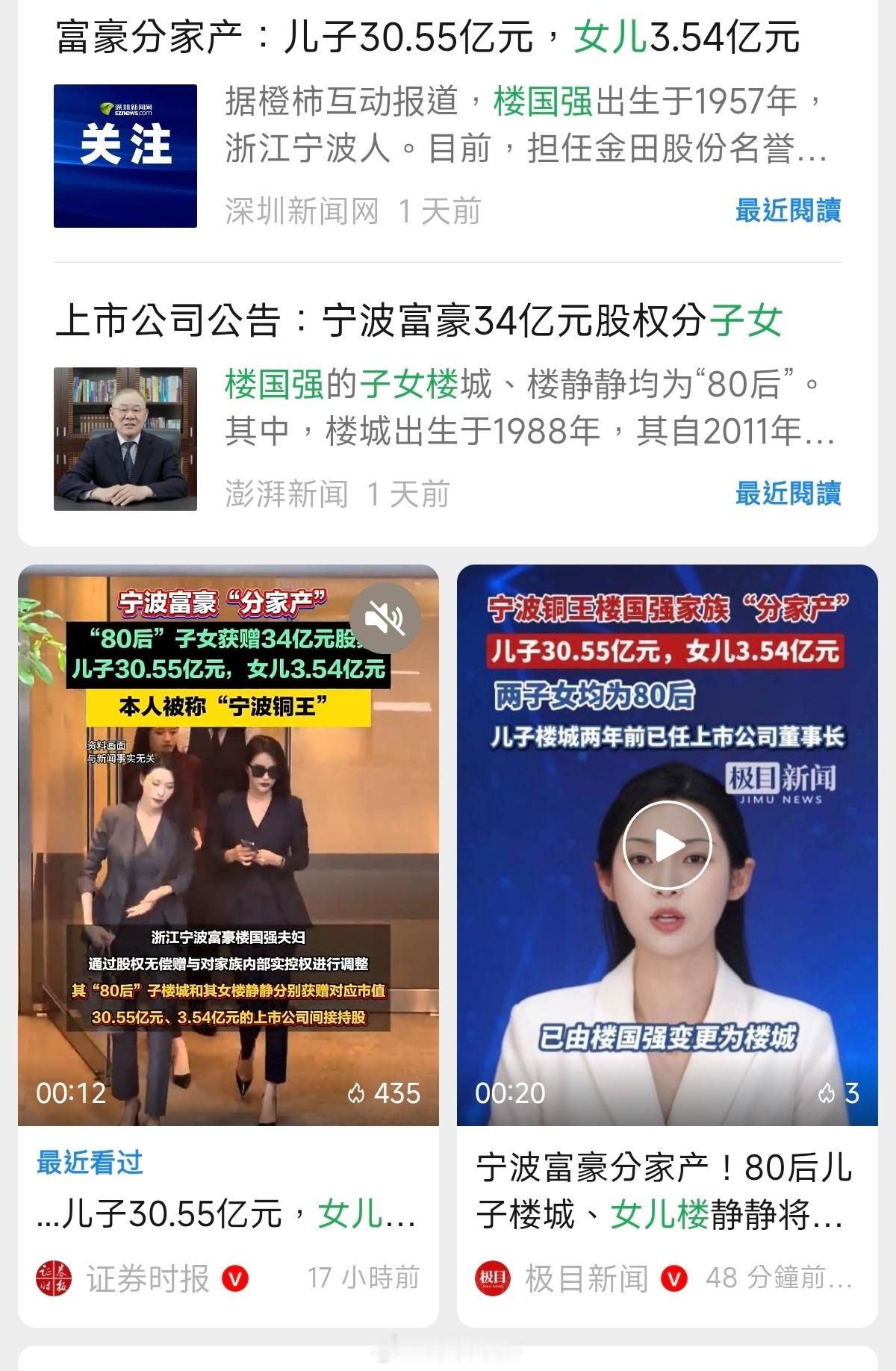 宁波上市公司富豪分家产,金田铜业,儿子分30.5亿,女儿3.5亿。很多人问为啥女的分这么少,姐姐现在公司管hr, 弟弟现在是公司董事长, 他爸觉得以后公司靠儿子发展, 多分了一些 。