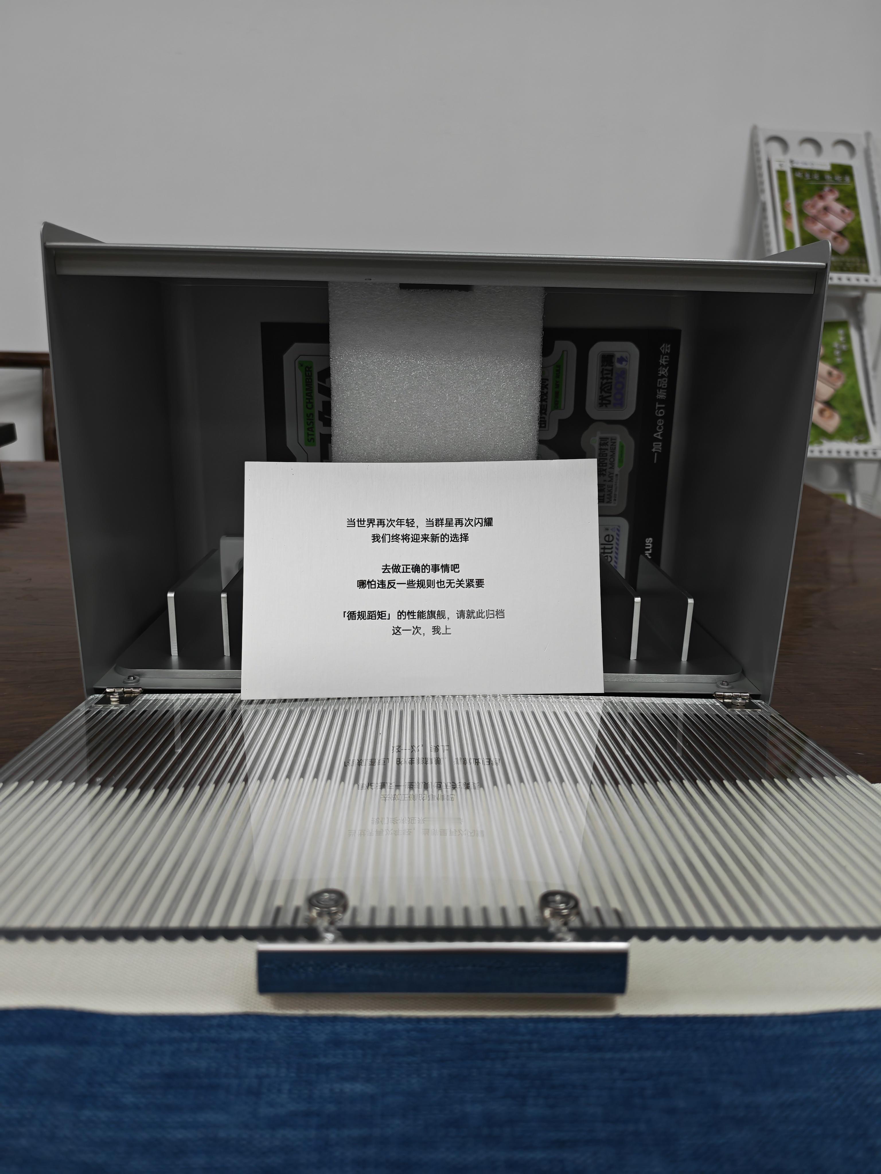 一加Ace6T 发布会还有不到一个小时就要开始了,子弹兄在后方收到了老婆拍的邀请函“手机休眠仓”。我回去就把这个休眠仓填满,羡慕我了吧?