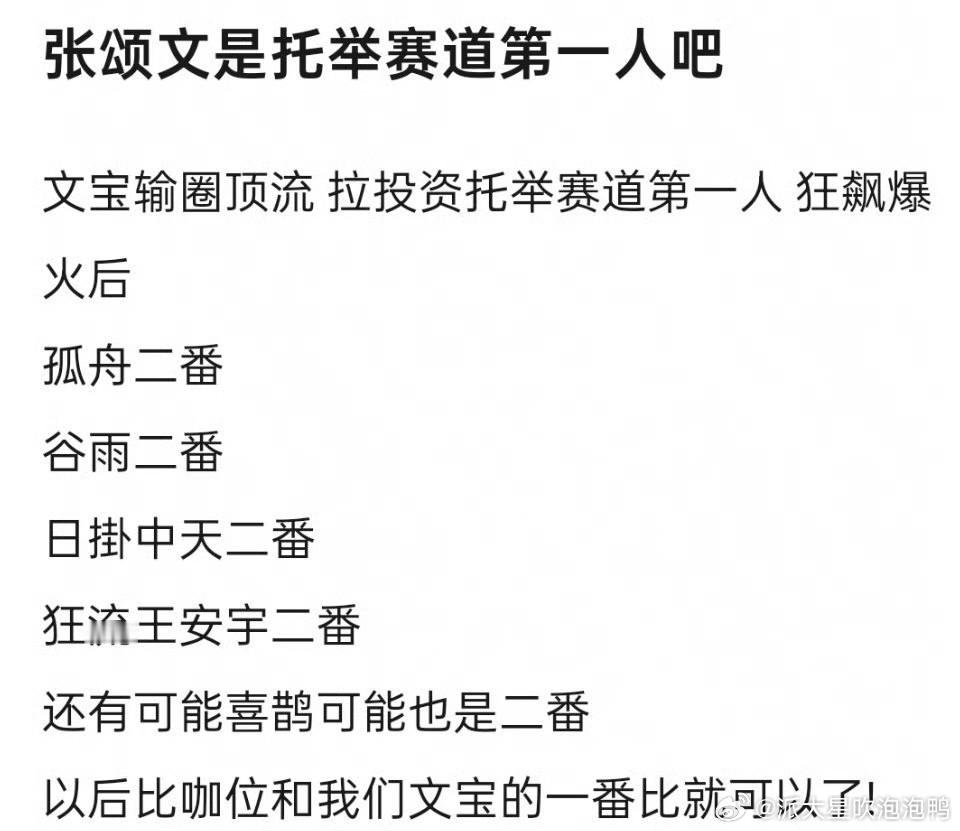 张颂文粉丝封张颂文是托举赛道第一人:《孤舟》托举曾舜晞《谷雨》托举井柏然《日挂中天》托举辛芷蕾《狂流》托举王安宇 怎么不说狂飙托举张译呢?雷打不动的二番,是自己低调选择了主动托举还是确实扛不住一番剧只能挑好的二番角色呢?