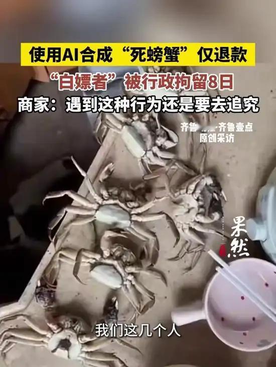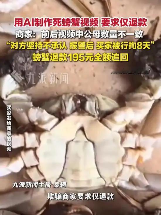 网购螃蟹“死蟹退款”闹剧:AI造假买家被拘! 2025年12月3日,一则电商纠纷有了新进展,引发关注。江苏一位卖螃蟹的电商工作人员此前遭遇了离奇一幕,一位客户网购8只螃蟹后,称收到6只死蟹,还发来图片和视频要求退款195元。 起初,客服看到图片中蟹脚翘起,与正常死蟹状态不符,又见视频里死蟹蟹腿朝上、蟹脐翻折,情况异常,怀疑是AI合成。不过,客户随后发来用手指逐个指螃蟹的视频,未发现破绽,客服便做了退款处理。 但客服越想越不对劲,回看视频时发现,第一段视频里6只死蟹是2公4母,第二段却变成3公3母,而当时卖给顾客的螃蟹是4公4母。客服再次联系客户,对方却没了回应。 好在警方介入调查后,真相大白。12月3日,商家透露,AI造假死螃蟹的买家被行政拘留8日,退款的195元也全额追回。这场闹剧终于落下帷幕,也给那些想利用手段骗取退款的人敲响了警钟。