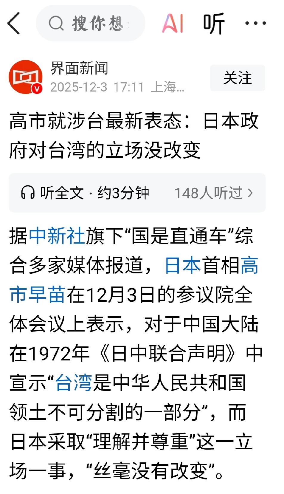 个人观点:绝不接受•当下日本领导层的表态 个人观点:日本当前领导人在12月3日的参议院全体会议上表示,对台湾的立场没改变。 个人认为:非常明显,日本的态度没有改变,只不过是措辞变化,还是一如既往的诡辩狡辩。 这是敷衍了事,这是伪装假象 ,恰恰说明了日本军国主义的“狡猾阴险本质”。 现在千万不可懈怠,一定保持高温高压的反制态度。