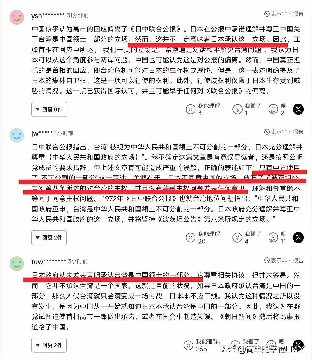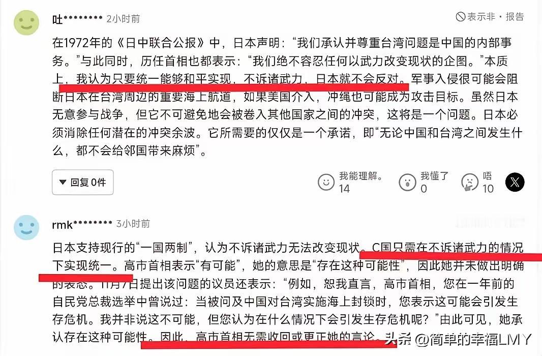 高市早苗态度突然软化,但仍避重就轻! 当地时间12月3日,日本参议院全体会议上的一场问答,首相高市早苗面对质询时的态度转变,看似释放缓和信号,实则暗藏玄机,而日本右翼网民的跟风拱火,更暴露了这背后根深蒂固的危险逻辑。 作为曾经在台湾问题上负有严重历史罪责的国家,日本本应谨言慎行,恪守承诺。1972年《中日联合公报》作为规范两国关系的基础性文件,明确载明日本政府充分理解和尊重台湾是中方领土不可分割的一部分。 这一立场通过后续《中日和平友好条约》等四个政治文件得到反复确认和巩固,具备不容置疑的法律约束力。可高市早苗上台以来,却屡屡突破红线,此前不仅叫嚣“T湾有事就是日本有事”,将T海局势与日本“集体自卫权”捆绑。 如今在参议院的质询中,高市早苗突然收起了往日的强硬姿态,不再提武力介入台海的狂言,反而强调日本政府立场与1972年《中日联合公报》一致。这一转变让不少人感到意外,难道这位以极右翼立场著称的首相真的幡然醒悟?答案显然是否定的。 她口中的“立场未变”,不过是避重就轻的话术游戏。《中日联合公报》的核心要义,正是日本对一中原则的认可与尊重,可高市早苗从头到尾都回避明确提及“台是中方领土不可分割的一部分”,更没有收回此前一系列涉台错误言论。 这种“选择性提及”的伎俩,根本骗不了明眼人。高市早苗的算盘打得精明,既想平息国际社会对其激进立场的担忧,又不愿放弃干涉台海的野心,妄图用这种模棱两可的表态蒙混过关,继续在台问题上“浑水摸鱼”。 更值得警惕的是,高市早苗的模糊表态,还点燃了日本右翼网民的“拱火”热情。在相关报道的评论区里,不少人公然歪曲《中日联合公报》的含义,声称日方只是“理解并尊重”中方立场,而非“承认”,甚至狂妄宣称日本从未、也绝不会承认一中原则。 还有些右翼网民更是暴露了干涉我们内政的野心,声称即便台问题是内政,日本也有权插手,理由竟是“反对以武力改变现状”。这是什么强盗逻辑?回顾高市早苗的涉台黑历史,其所谓的“立场软化”更显虚伪。 她曾多次会见“T独”政客,其内阁更是充斥着大量亲台反华政客。仅凭一句模糊的“遵守公报”,就能洗白过往的种种挑衅?历史已经证明,日本右翼势力的野心从未熄灭,从否认侵略历史到参拜靖国神社,从鼓吹“T湾有事”到试图突破和平宪法,每一步都暗藏着危险的企图。 台湾是中国领土不可分割的一部分,这一事实有着坚实的历史、法律、文化和国际关系基础,是任何人、任何势力都无法改变的。《中日联合公报》等四个政治文件是中日关系的政治基础,日本政府既然承诺遵守,就应当言行一致,而不是玩文字游戏、搞双重标准。 任何试图歪曲历史、模糊焦点、干涉中方内政的行为,都是在挑战我们的核心利益,也都是在往历史的错误方向倒退。“玩火者必自焚”,这句古训值得日本某些政客和右翼势力深思。 历史上,日本军国主义因对外侵略扩张给包括中方在内的亚洲各国人民带来了深重灾难,最终也招致灭顶之灾。如今,某些人好了伤疤忘了疼,再次在台问题上蠢蠢欲动,妄图干涉他国内政,挑战战后国际秩序,这种行为不仅违背历史潮流,更会给日本自身带来难以预料的后果。 我们有坚定的意志、充分的信心和足够的能力,挫败任何形式的“T独”。任何国家、任何势力都不要低估中国人民捍卫国家主权和领土完整的决心,不要误以为可以用模糊话术蒙混过关,更不要幻想能够阻挡中国统一的历史进程。 台湾回归祖国、实现国家完全统一,是大势所趋、民心所向,是不可阻挡的历史潮流。日本方面应当认清形势,摒弃侥幸心理,恪守一中原则和中日四个政治文件精神,停止在台湾问题上的任何挑衅行为,停止纵容右翼势力的危险言论,否则必将给中日关系带来严重损害,承担由此引发的一切后果。