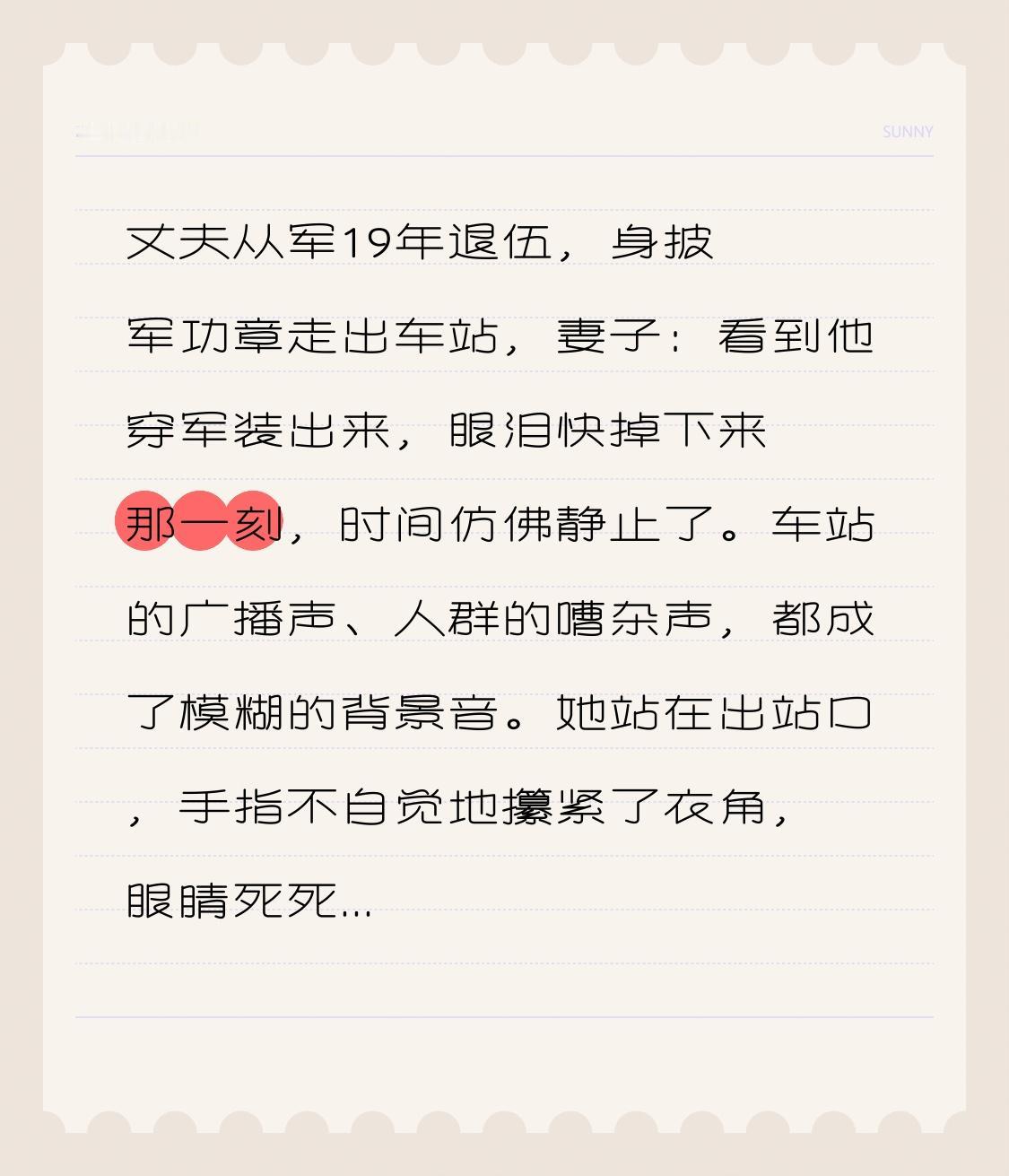 丈夫从军19年退伍,身披军功章走出车站,妻子:看到他穿军装出来,眼泪快掉下来 那一刻,时间仿佛静止了。 车站的广播声、人群的嘈杂声,都成了模糊的背景音。她站在出站口,手指不自觉地攥紧了衣角,眼睛死死盯着那道绿色身影——19年,6840多个日夜,她终于等到了这一刻。 当丈夫身披军功章,穿着笔挺的军装出现在视线里时,她的眼泪再也绷不住了。“我以为自己会很坚强,可看到他的一瞬间,眼泪根本控制不住。” 这不是电影里的情节,而是真实发生在某高铁站的动人一幕。 19年,他错过了什么? 19年,足以让一个青涩少年变成沉稳的中年人,也足以让一个家庭经历无数个“缺席”的瞬间。 他错过了孩子的第一次走路、第一次上学、第一次叛逆期…… 他错过了妻子的生日、结婚纪念日、甚至父母的白发渐生…… 可即便如此,妻子从未抱怨过一句。“他在保家卫国,我在守着小家,我们都在做该做的事。” 军功章背后,是无数个“对不起” 那些军功章,每一枚都沉甸甸的。它们代表的不仅是荣誉,更是无数个无法陪伴家人的日夜。 “每次视频,他都说‘快了,再坚持一下’,可这一坚持就是19年。” 妻子说,最怕的不是等待,而是电话突然打不通的时候。“有时候训练、出任务,好几天联系不上,那种提心吊胆的感觉,只有军嫂才懂。” “他回来了,可有些人永远回不来了” 评论区有人问:“19年,值得吗?” 值得。因为军人的坚守,从来不是为了被歌颂,而是为了让更多人不必经历分离。 可我们也不能忘记,有些军人的军装,永远定格在了黑白照片里;有些军嫂的等待,再也等不到归期。 致敬所有默默付出的军人和军属 军人守护国家,军嫂守护家庭。 他们的故事,没有轰轰烈烈的剧情,却有着最动人的力量。 如果你也被感动了,请在评论区留下你的祝福。 如果你身边也有这样的军人家庭,请给他们一个拥抱。 因为,他们的付出,值得我们每一个人记住。退伍时候的感想 退伍兵夫妻 退伍后感悟 车站遇退伍军人