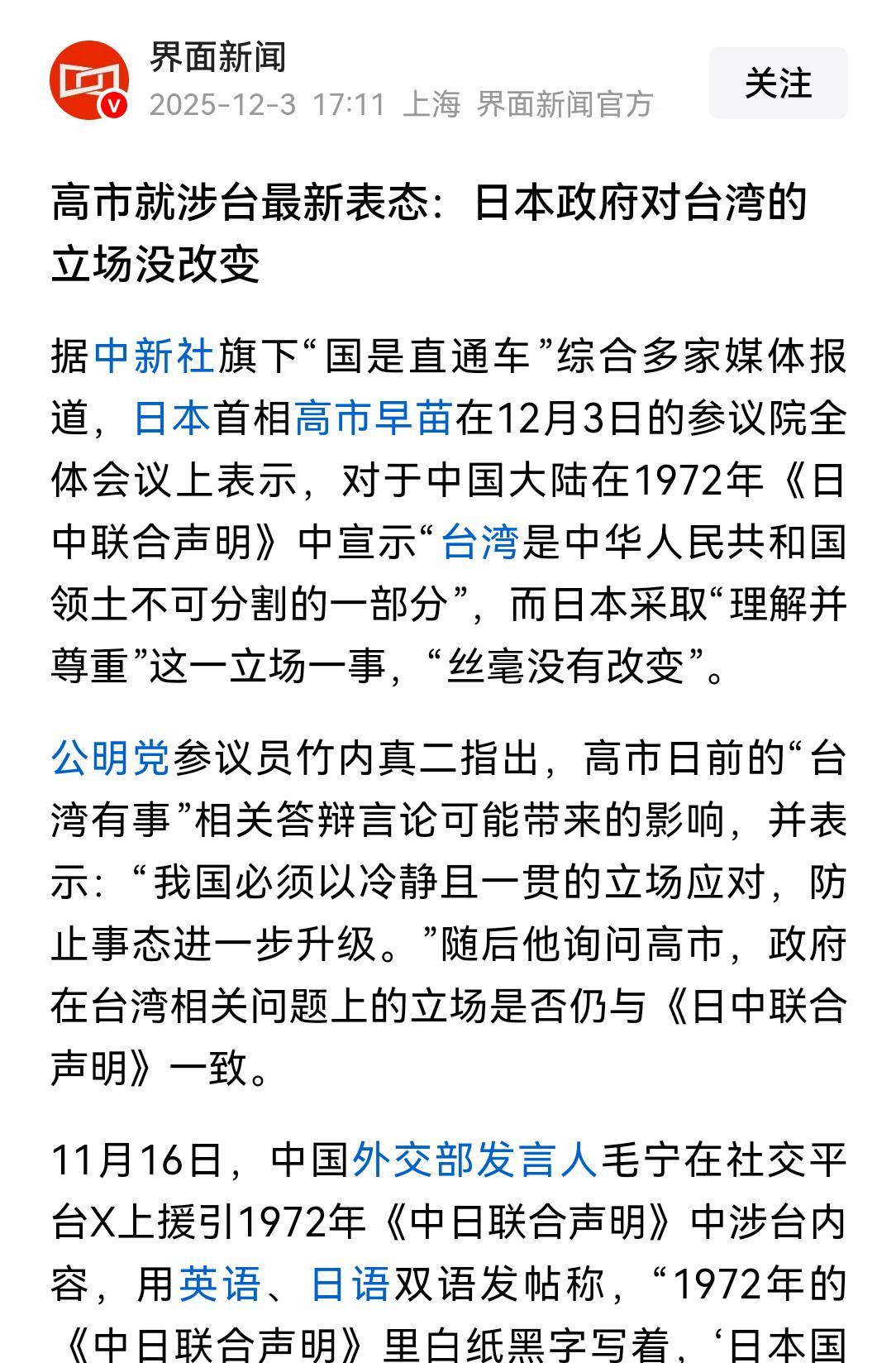 高市早苗又改口了[呲牙][呲牙][呲牙] “台湾是中华人民共和国不可分割的一部分”,日本采取“理解并尊重”,这一立场,“丝毫没有改变”! 她在国会重新表态了! 经过国家不断重申和施压,现在她对涉台言论进行了重新阐述! 中国🇨🇳🇨🇳威武!中国必胜! 但对日本也是不能大意,谨防背后搞事! 对此,你怎么看? 高市称日本政府对台湾的立场没改变