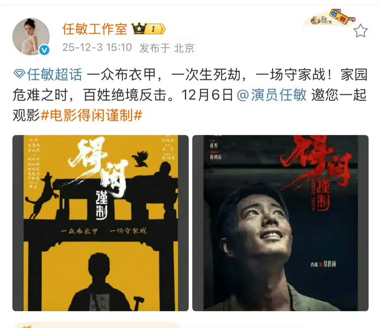 任敏包场得闲谨制 任敏包场电影《得闲谨制》,分别支持合作过的正午阳光和肖战,水端平了
