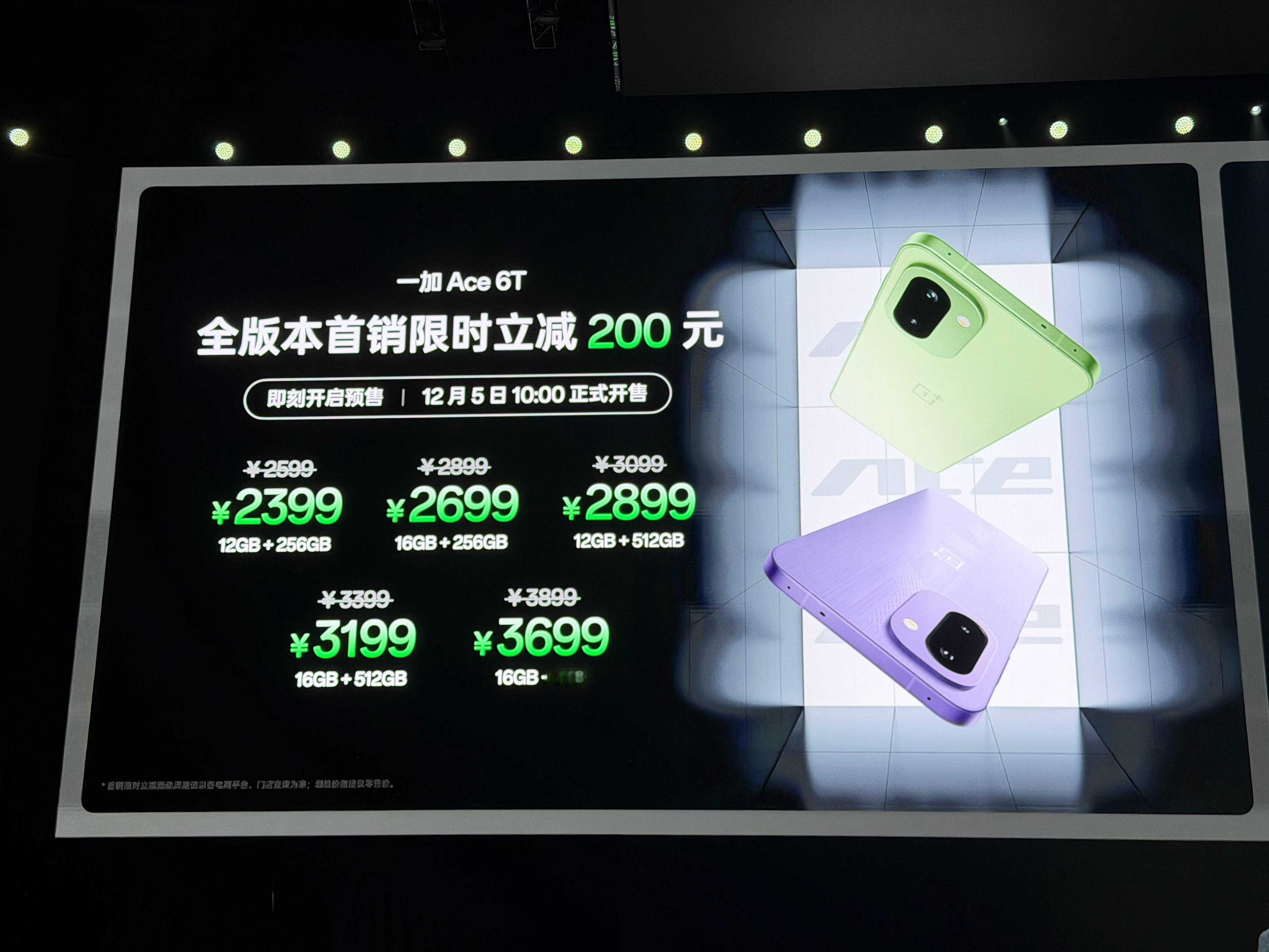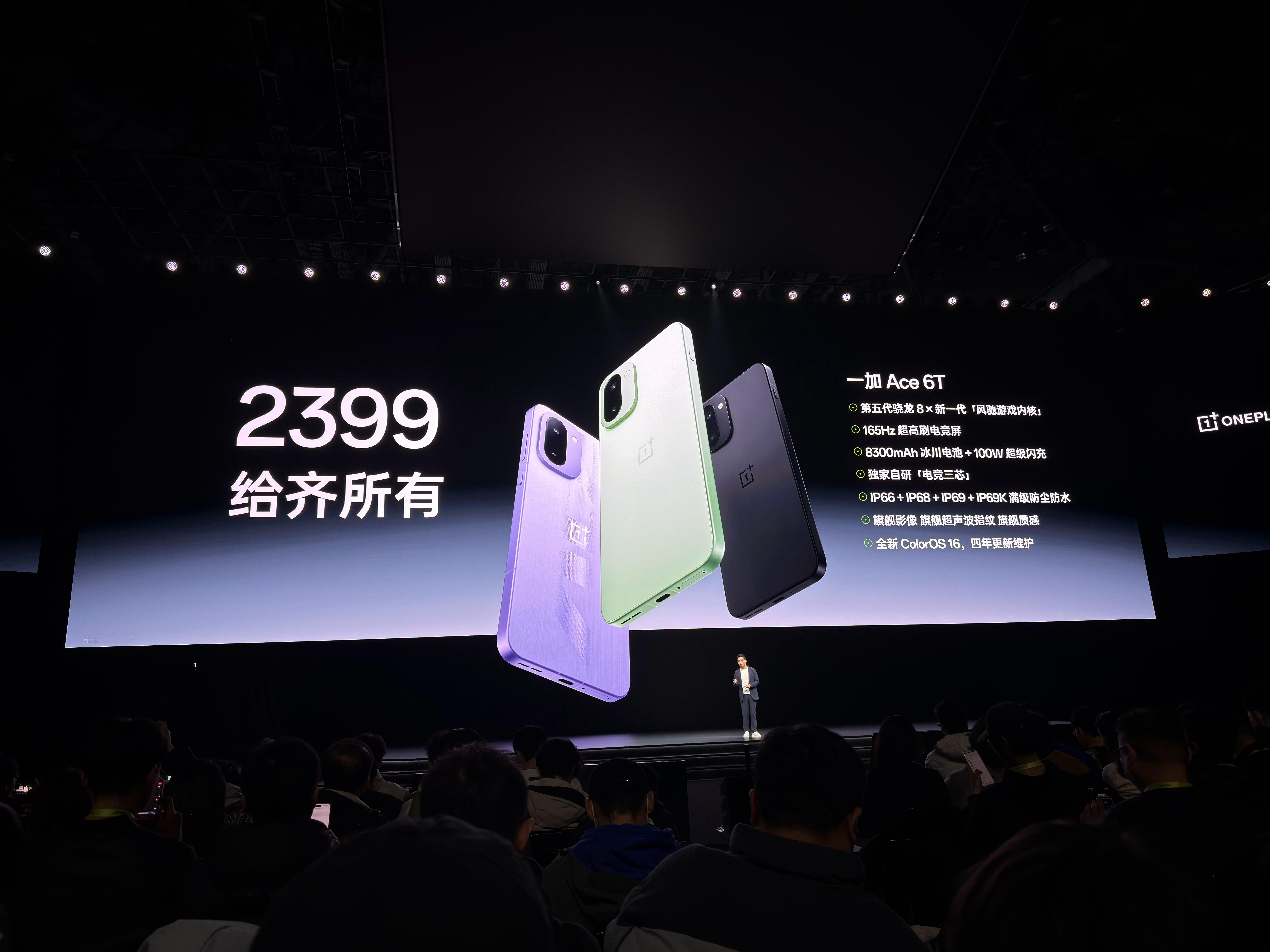 一加 Ace 6T正式发布,配置信息刹那速览⬇️配色/重量/机身三围闪速黑 / 掠影绿:厚 8.3mm,重约 216g电光紫(玻纤背板):厚 8.1mm,重约 211g。  机身尺寸:长 163.4mm × 宽 77.1mm核心性能芯片:全球首发第五代骁龙 8(3nm 工艺)存储:LPDDR5X Ultra + UFS 4.1,游戏优化:写入「风驰游戏内核」,搭配电竞网络芯片 G2 + 灵犀触控芯屏幕参数:6.83 英寸 165Hz Ultra 级电竞屏,支持 3840Hz 高频 PWM 调光(莱茵护眼 5.0)亮点:行业首发《和平精英》原生 165 帧模式;标配超声波指纹;触控采样率瞬时高达 3200Hz,五指采样率 330Hz,十指采样率 290Hz。影像主摄:5000 万像素索尼 IMX906,1/1.56 英寸大底,f/1.8 光圈,支持 OIS 光学防抖超广角:800 万像素前置:1600 万像素续航与散热电池:8300mAh 冰川电池 + 100W 闪充。支持有线反向充电散热:43940mm² 散热面积,升级了冰河 VC 和石墨,专门压制高负载。外围与质感机身:金属中框 + 玻璃背板(OPPO 晶盾玻璃),新增自定义实体快捷键。防护:IP66/68/69/69K 满级防尘防水,耐造属性拉满。共5个内存版本,到手价2399元起。
