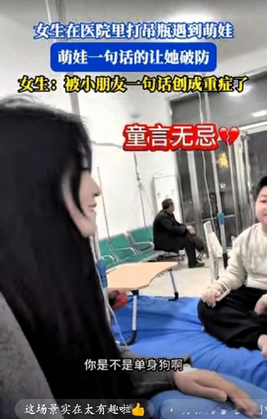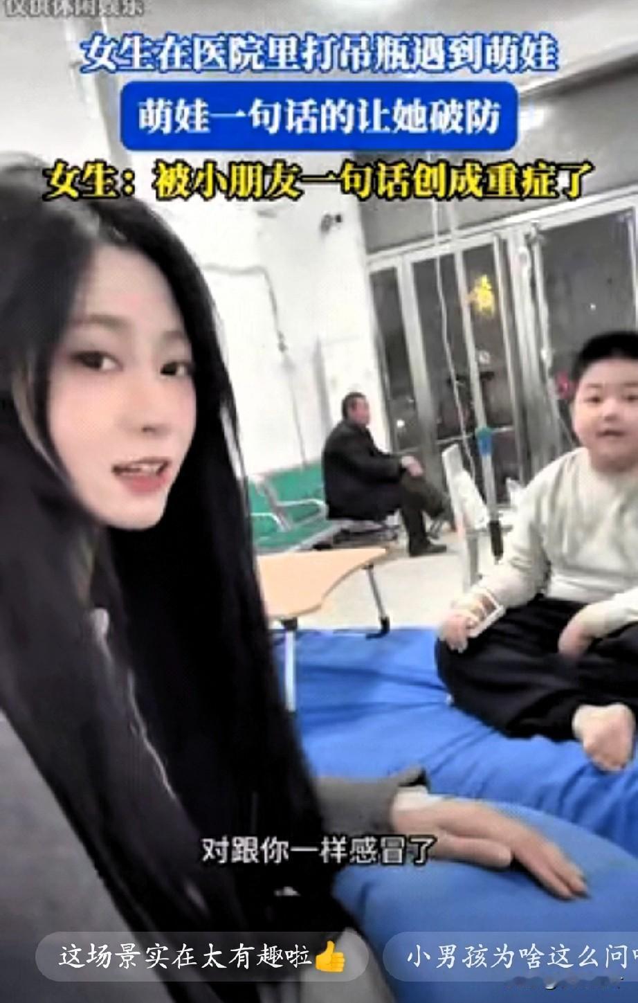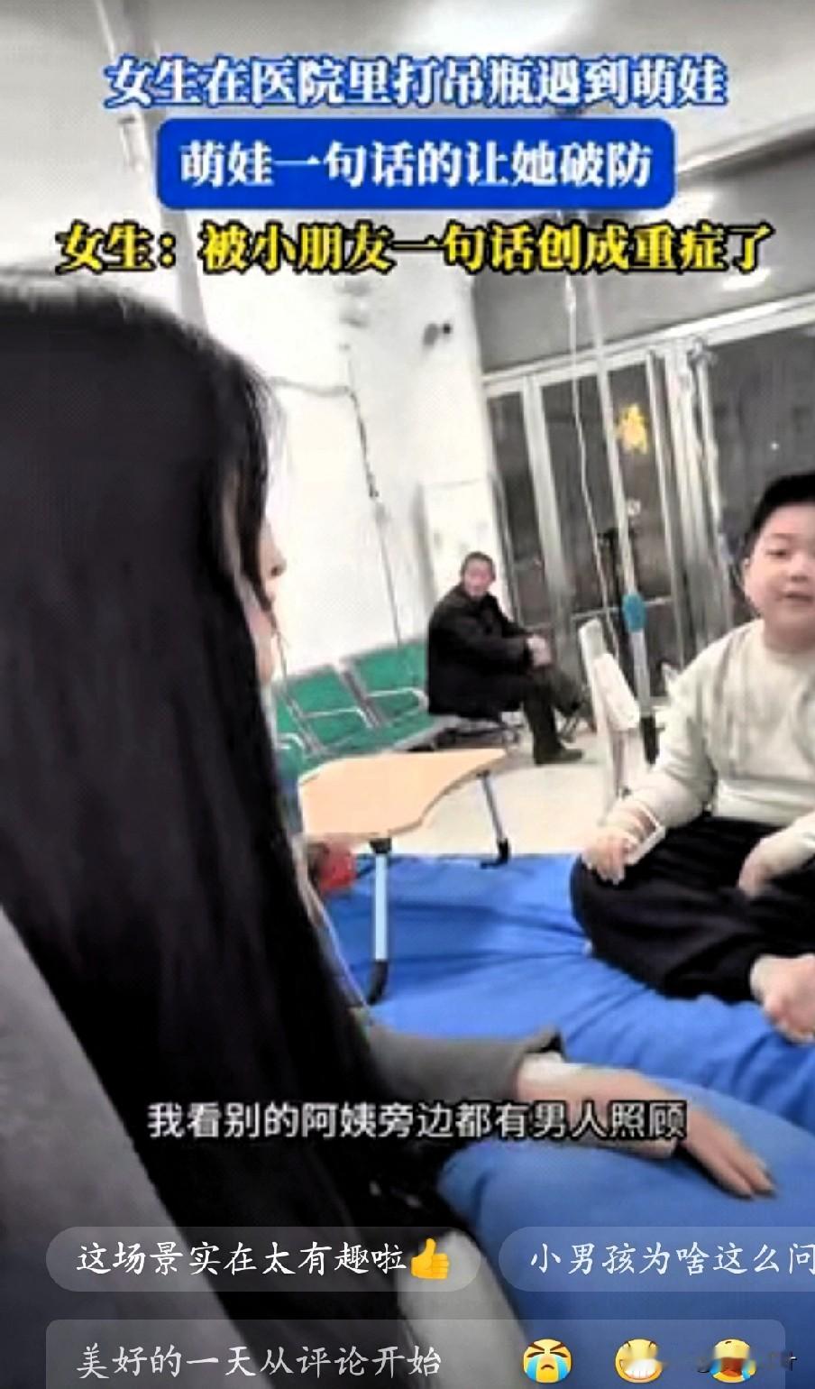 笑不活了!山东一女子因感冒去医院打吊瓶,不料隔壁床的小男孩一句话,给她整破防了…… 最近天气忽冷忽热,昼夜温差拉满,不少人都没能扛住感冒的侵袭,这位小姐姐也不幸中招,只能一个人拖着病恹恹的身子到医院输液。 刚坐下没多久,邻床的小男孩就凑了过来,先是奶声奶气地问她是不是也感冒了,得到肯定答复后,小家伙眨巴着圆溜溜的大眼睛,突然抛出灵魂拷问:“我看别的阿姨输液都有叔叔陪着,你咋就自己一个人来呀?你是不是单身狗?” 这话一出,小姐姐直接当场破防,捂着脸无奈点头认栽,那委屈又好笑的模样,瞬间戳中了无数网友的笑点。 视频传到网上后,评论区直接炸开了锅,有人调侃这是“双重暴击”,既被喊了阿姨又被戳中单身痛点;也有人感慨小孩童言无忌,虽然说话直白,却句句都是没掺假的“大实话”;还有不少有过同款经历的网友纷纷留言,说独自看病的滋味只有自己能懂。 在我看来,这事儿看着是个搞笑段子,实则藏着很多在外打拼年轻人的无奈。独自扛病早已成了不少人的生活常态,小孩的无心之言,不过是把大家不愿言说的孤独摊在了明面上。 但反过来想,能一个人坦然面对生病、处理琐事,何尝不是一种独立和坚强的体现。这种独自扛事的底气,远比一时有人陪伴更难得,毕竟生活的安全感,从来都是自己给的,单身与否,都能把日子过得热气腾腾。
