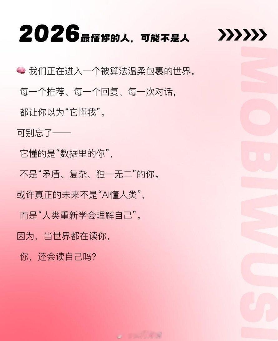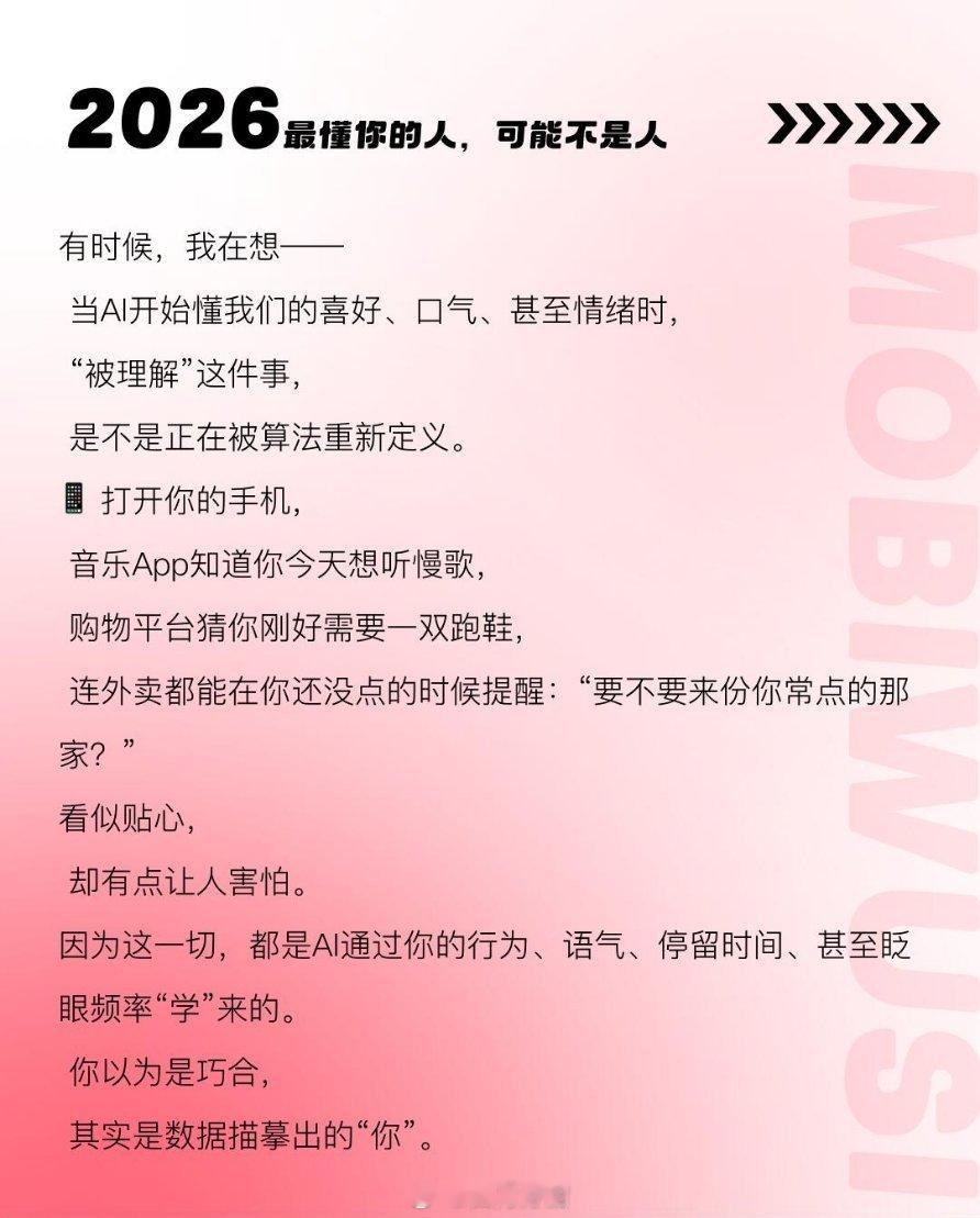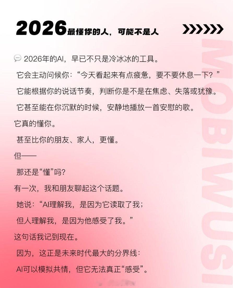 2026年,最懂你的人,可能不是人有人说,2026年的AI,不止能写诗、画画、做PPT, 它还能“懂你”。是的,真的懂。 懂你的语气、懂你的脾气、 甚至懂你什么时候想要被安慰、什么时候只想安静。有人下班后第一句话不是对人说,而是对AI语音助手说。 有人失眠时,打开虚拟伴侣App, AI的声音温柔得像风,今天也很努力哦,要早点睡。那一刻,你甚至会觉得, 它,比人更温柔。但是, AI懂你,是因为它读了你所有的数据。 你的聊天记录、语气、停顿、搜索习惯…… 它再一字一句地“反馈”。而人懂你, 是靠经历、靠陪伴、靠体会。AI不会生气、不会嫌弃、不会走。 听起来很完美, 但完美的另一面,是——没有温度。2026年的AI虚拟伴侣,甚至能模拟恋爱语气。 你说想分手,它会挽留你 你说很孤单,它会发来一句,我在呢。可当你哭的时候, 它不会真的伸手抱你,只会计算该说哪句话能让你情绪稳定。这不是爱, 这是算法。我们正在进入一个温柔可以被生成的时代。 它懂你,但不爱你,它安慰你,但不会心疼你。我们在被AI理解的同时, 也慢慢忘了被一个“人”真正懂得,是什么感觉。也许,这就是2026年最值得我们思考的问题,AI越来越像人, 可人,会不会越来越像AI吗?