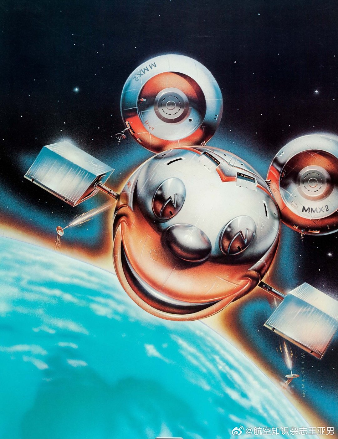 1980年,麦克马尔肯为迪士尼频道设计了这张推广海报,3年后频道开播。艺术家在画面上绘制了米老鼠造型的人造卫星,十分可爱的同时直观地传达了该频道卫星播发的技术特点。迪士尼在太空科普方面做了许多传播工作,沃尔特迪士尼本人和布劳恩等大佬都加盟其中,第一次为人类描摹了太空时代的宏伟蓝图。