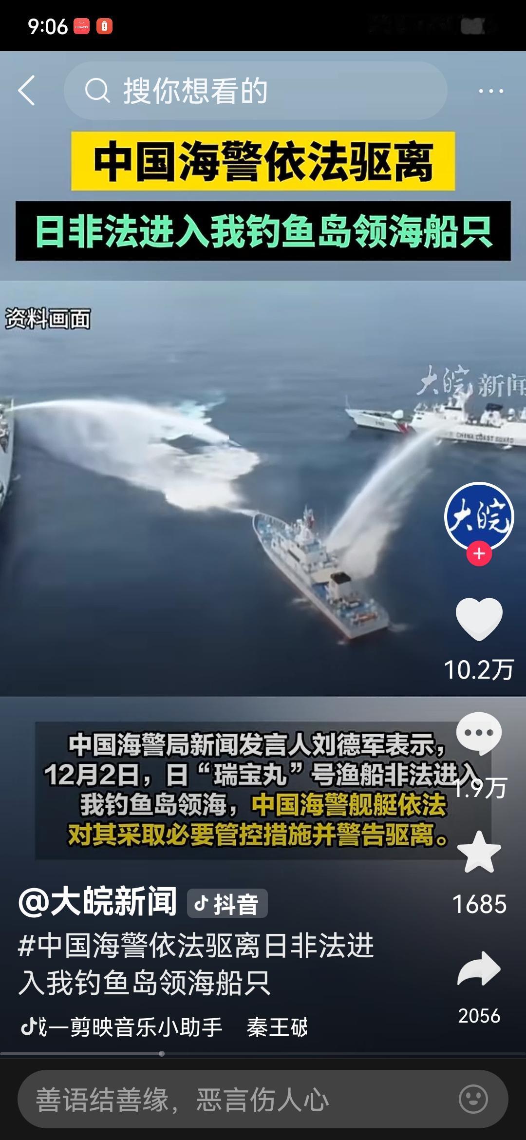 战斗在钓鱼岛! 目前钓鱼岛的情况是中国海警完全实控,日本的各种船只根本不可能进入钓鱼岛12海里。中国海警船对钓鱼岛实现全年常态化巡航。2021年巡航332天,2022年336天,2023年352天。中国海警船多次驱离日方的入侵船只。 最近的一次是2025年11月16日,日本一艘瑞宝丸号渔船入侵钓鱼岛海域,我正在巡航的1307舰海警舰艇编队,依法对其进行驱离。 这样的斗争经常都会遇到,这个瑞宝丸可不是一个好鸟,近几年来,几乎每年都要来骚扰一些,但是在我强大的中国海警舰艇编队面前,就像一个玩具,被轻松拿捏。 随着我们对钓鱼岛的掌控力度的增长,日本的骚扰也就是越来越敷衍了,象征性的来骚扰一下。 我英勇的中国海警战士,从来都不会惯着,每一次都是坚决,专业,碾压式的驱离。 下一步,我们钓鱼岛会采取逐步升级的方式管控,就像在黄岩岛设立海洋环境保护区那样,更有效的实际控制。
