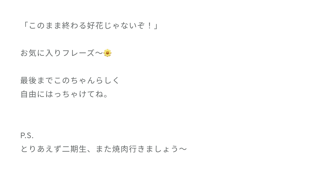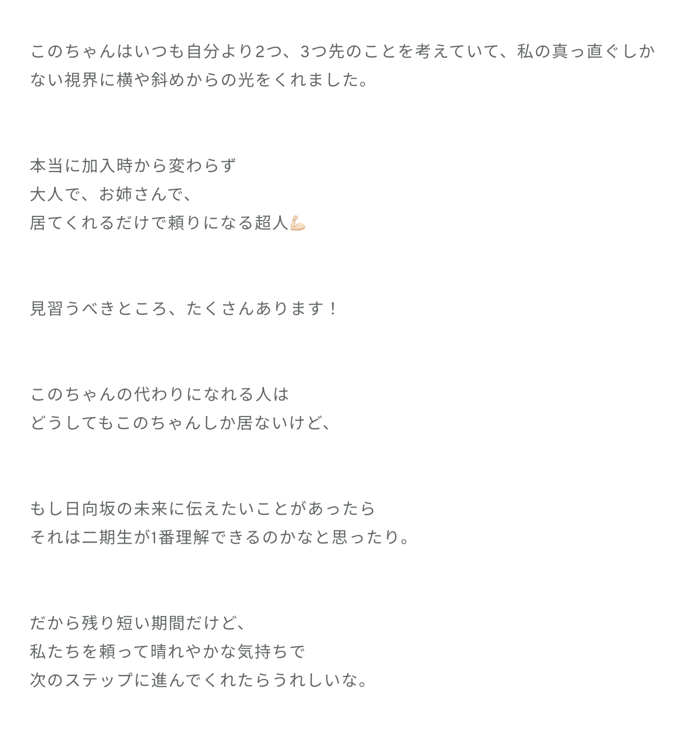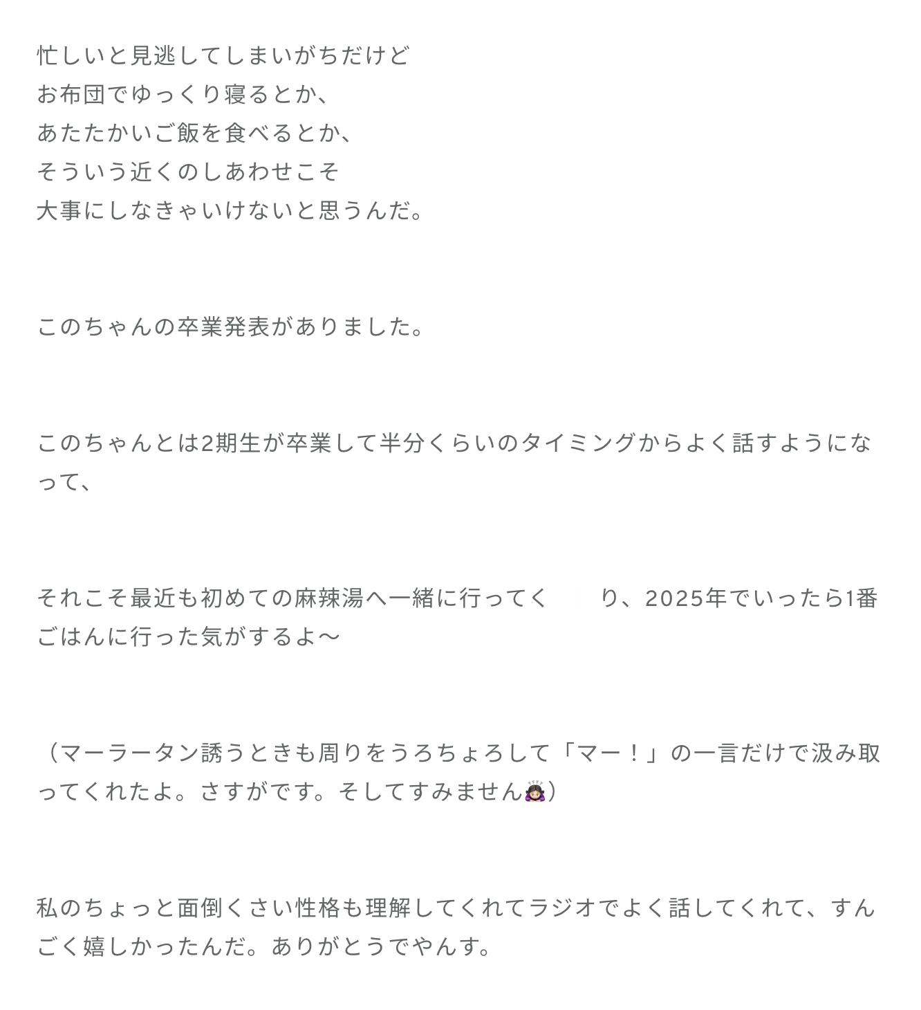 みく「このちゃんとは2期生が卒業して半分くらいのタイミングからよく話すようになって、それこそ最近も初めての麻辣湯へ一緒に行ってくれたり、2025年でいったら1番ごはんに行った気がするよ〜。(マーラータン誘うときも周りをうろちょろして「マー!」の一言だけで汲み取ってくれたよ。さすがです。そしてすみません🙇🏻♀️)私のちょっと面倒くさい性格も理解してくれてラジオでよく話してくれて、すんごく嬉しかったんだ。ありがとうでやんす。」