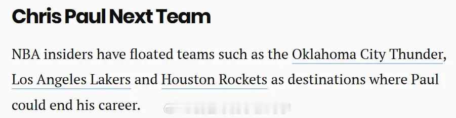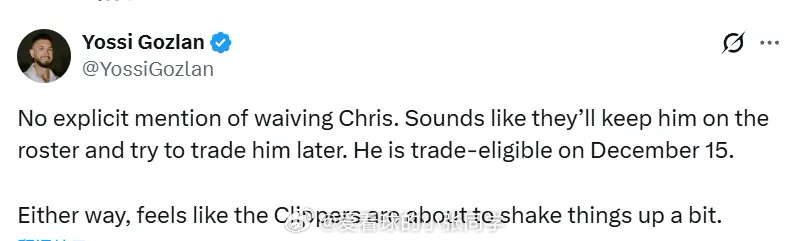 快船仍有可能交易保罗!圈内人士列三大潜在下家:雷霆湖人和火箭nba 北京时间12月3日,快船队将克里斯-保罗移出球队阵容,不过严格意义上,快船尚未正式裁掉保罗,这意味着这位老将可在12月16日(北京时间)具备交易资格后被送至其他球队。薪金专家戈兹兰指出,快船在官宣这一劲爆消息的声明中,并未提及“裁掉保罗”的相关表述。“声明里没明确说要裁克里斯,听着像是他们会先把他留在阵容名单里,之后再尝试交易。他12月16日就能被交易了。不管怎样,快船这是要开始搞点大变动了。”NBA圈内人士已列出多支可能成为保罗生涯终点站的球队,包括俄克拉荷马城雷霆、洛杉矶湖人和休斯顿火箭。保罗曾短暂效力雷霆期间,对年轻的亚历山大起到了关键的指导作用,还与这位加拿大球员建立了深厚情谊。他不仅到场观战了2025年NBA总决赛,为亚历山大和雷霆队助威,还在球队历经七场大战击败印第安纳步行者夺冠后,参与了球队的庆功活动。由此来看,保罗若能在生涯最后一季助力雷霆实现NBA两连冠,同时为自己斩获那枚梦寐以求的总冠军戒指,无疑是最圆满的谢幕方式。再看湖人队,保罗与詹姆斯、雷迪克私交甚笃,且本身就定居洛杉矶,加盟湖人可谓顺理成章。事实上,他休赛期选择签约快船,也是为了能就近陪伴子女和家人。火箭队同样是颇具吸引力的选择。自从范弗利特因前交叉韧带撕裂赛季报销后,休斯顿就一直缺少一位久经沙场的主控。尽管谢泼德和阿门-汤普森作为持球手表现不俗,但保罗完全可以在季后赛中担任球队的替补控卫,为球队提供助力。要知道,保罗曾在2018年助力火箭队闯入过西部决赛。这位传奇控卫于休赛期以一份为期1年价值229万美元的老将底薪合同加盟快船。他还在11月23日通过社交媒体发文确认,2025-26赛季将是自己的生涯收官之战。没想到10天之后,他就被快船放弃了。