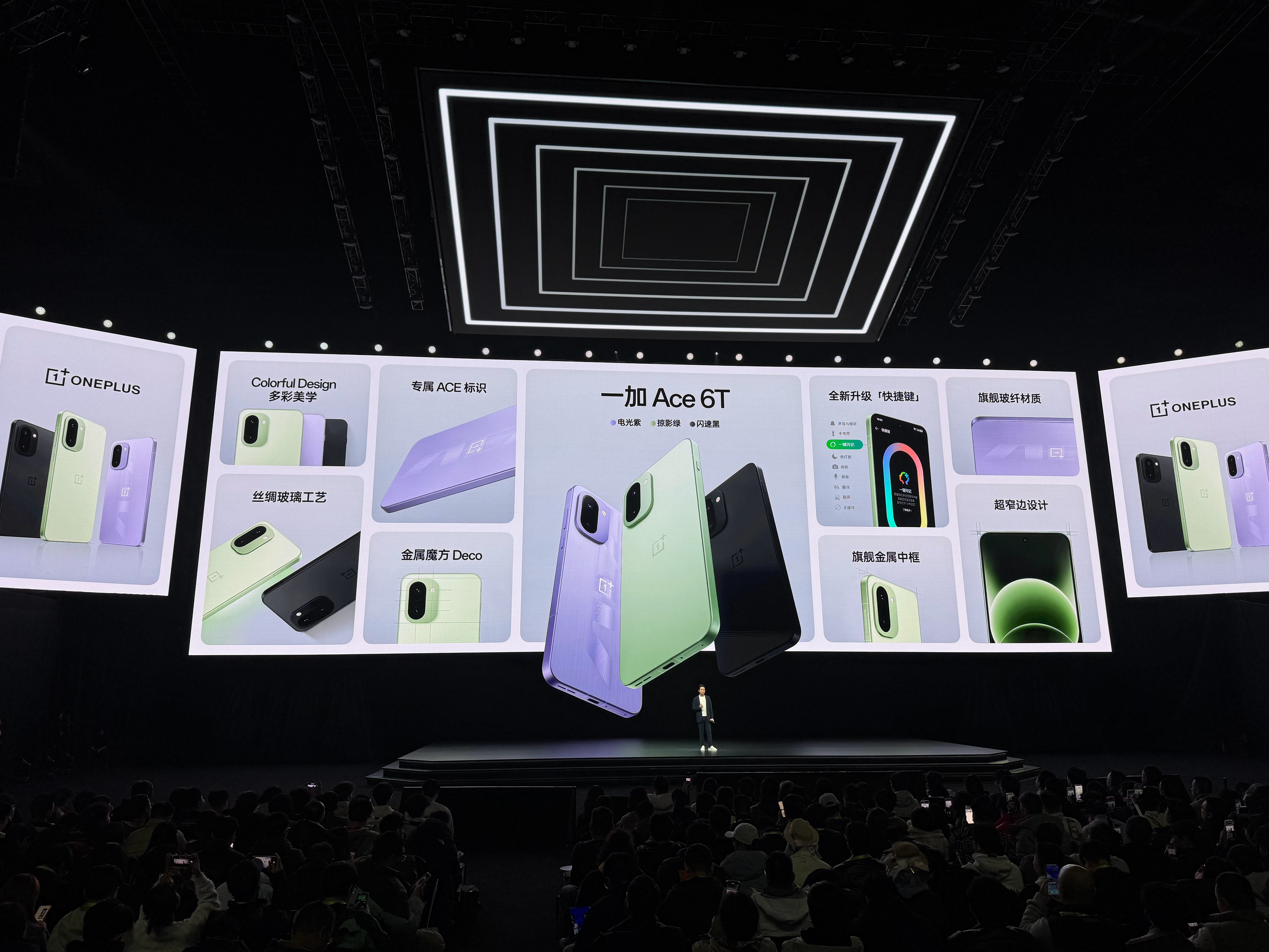 一加Ace6T 有掠影绿、电光紫、闪速黑三款配色,金属魔方Deco,搭配圆润黄金R角与高强度微弧金属中框…