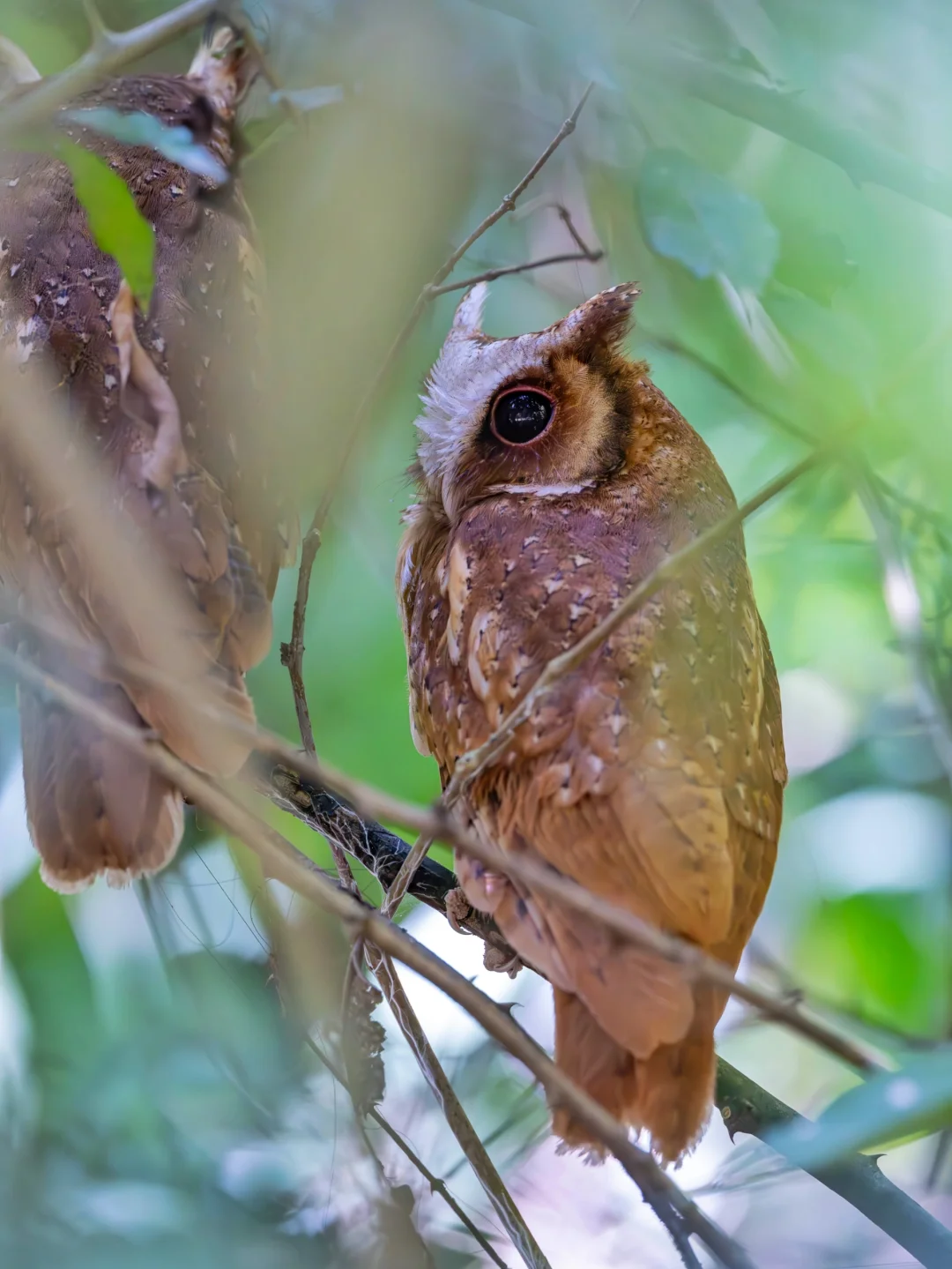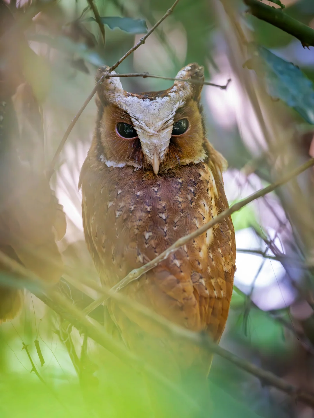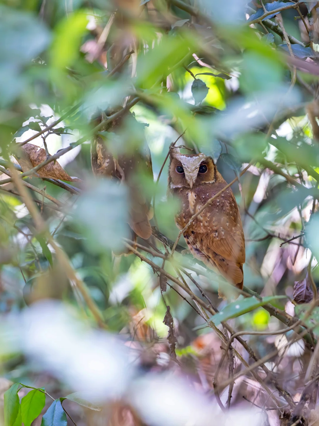 白额角鸮以白色的三角形额头著称,非常明亮,非常独特。身上是深栗色带有模糊的淡黄色斑点。看上去像是枯叶和周遭的丛林灌木树枝融为了一体。这次这两只白额角鸮的寻找也是充满了曲折,从这么隐蔽在现场也知道鸟导小哥能找到,实在是太不容易了。