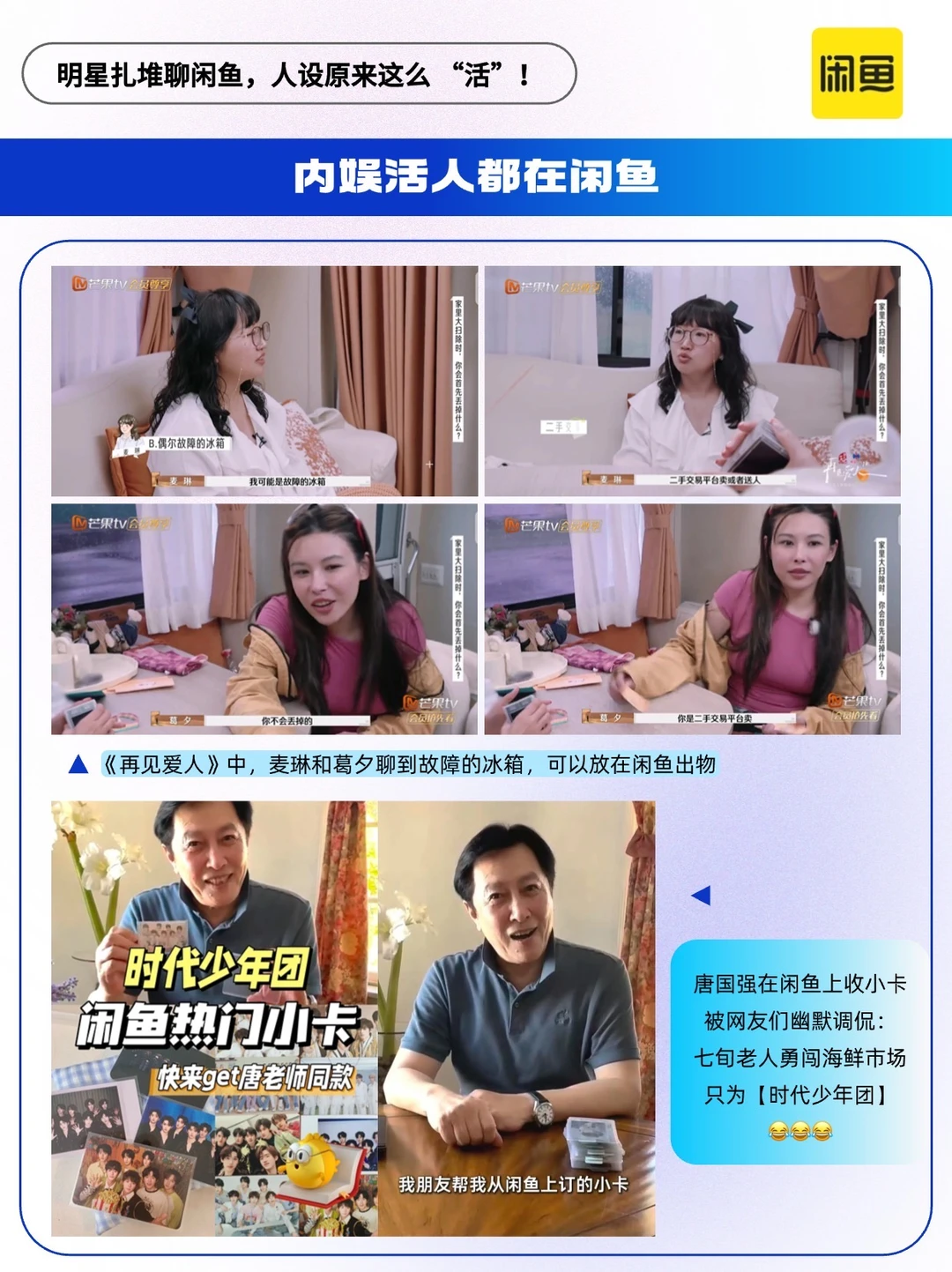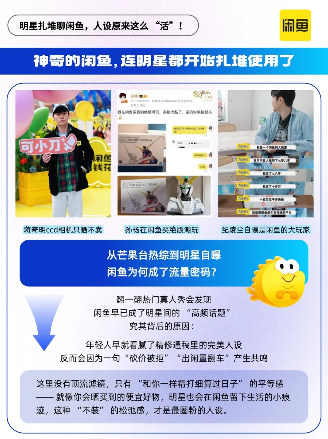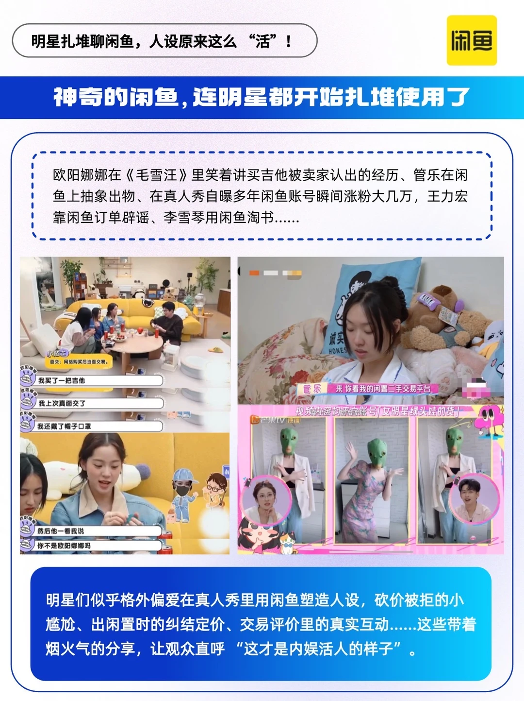 明星扎堆闲鱼,买卖闲置,熟练使用“小刀”梗,这种“仿佛演我”的日常,让“用闲鱼”和“活人感”在娱乐圈画上了等号。从明星到普通用户,每个人都在用自己的方式开发闲鱼、定义闲鱼🤓