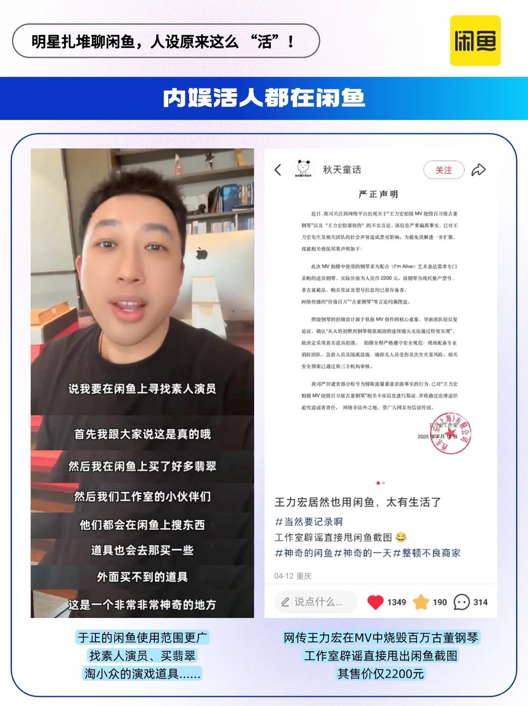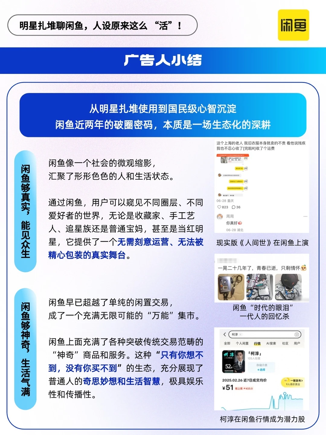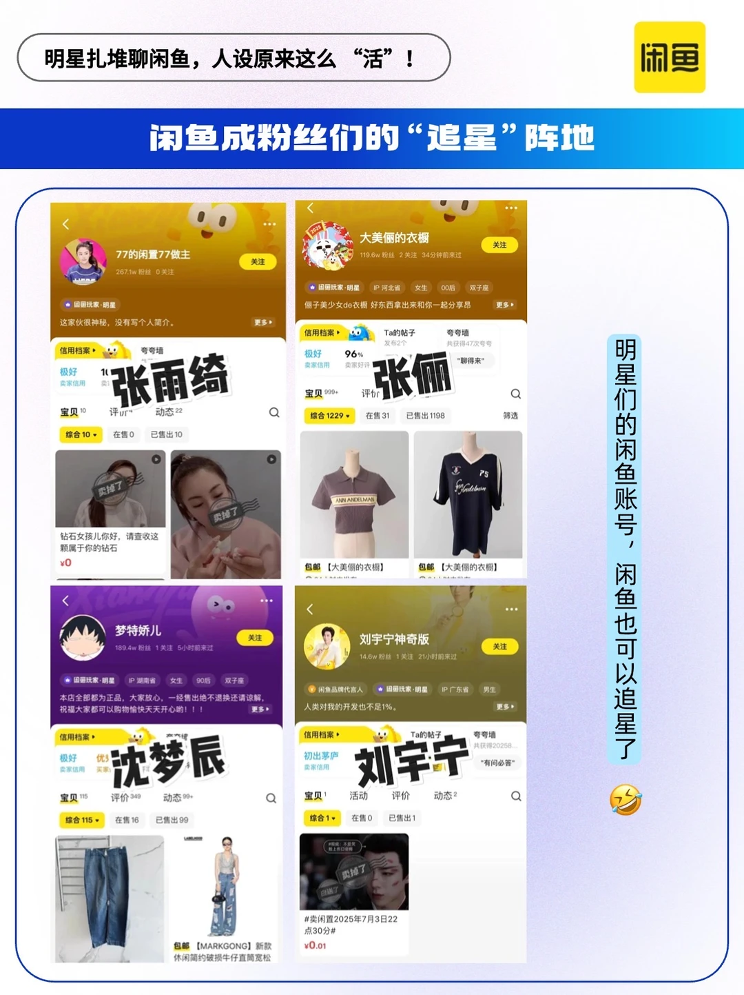 明星扎堆闲鱼,买卖闲置,熟练使用“小刀”梗,这种“仿佛演我”的日常,让“用闲鱼”和“活人感”在娱乐圈画上了等号。从明星到普通用户,每个人都在用自己的方式开发闲鱼、定义闲鱼🤓