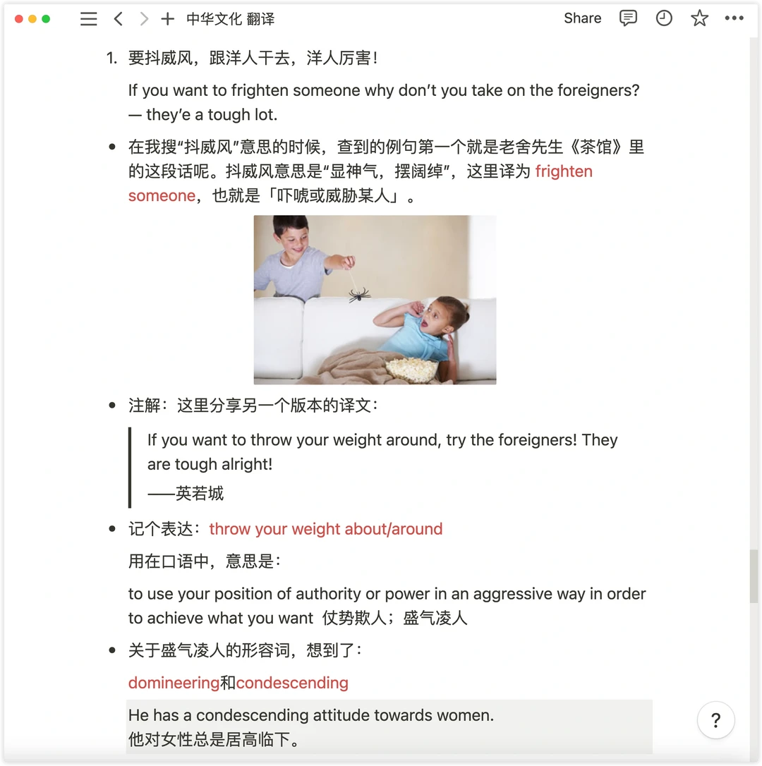 抖威风意思是“显神气,摆阔绰”,这里译为 frighten someone,也就是「吓唬或威胁某人」。