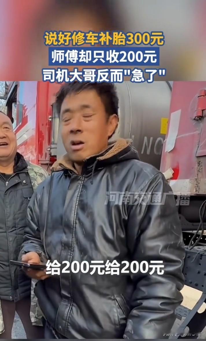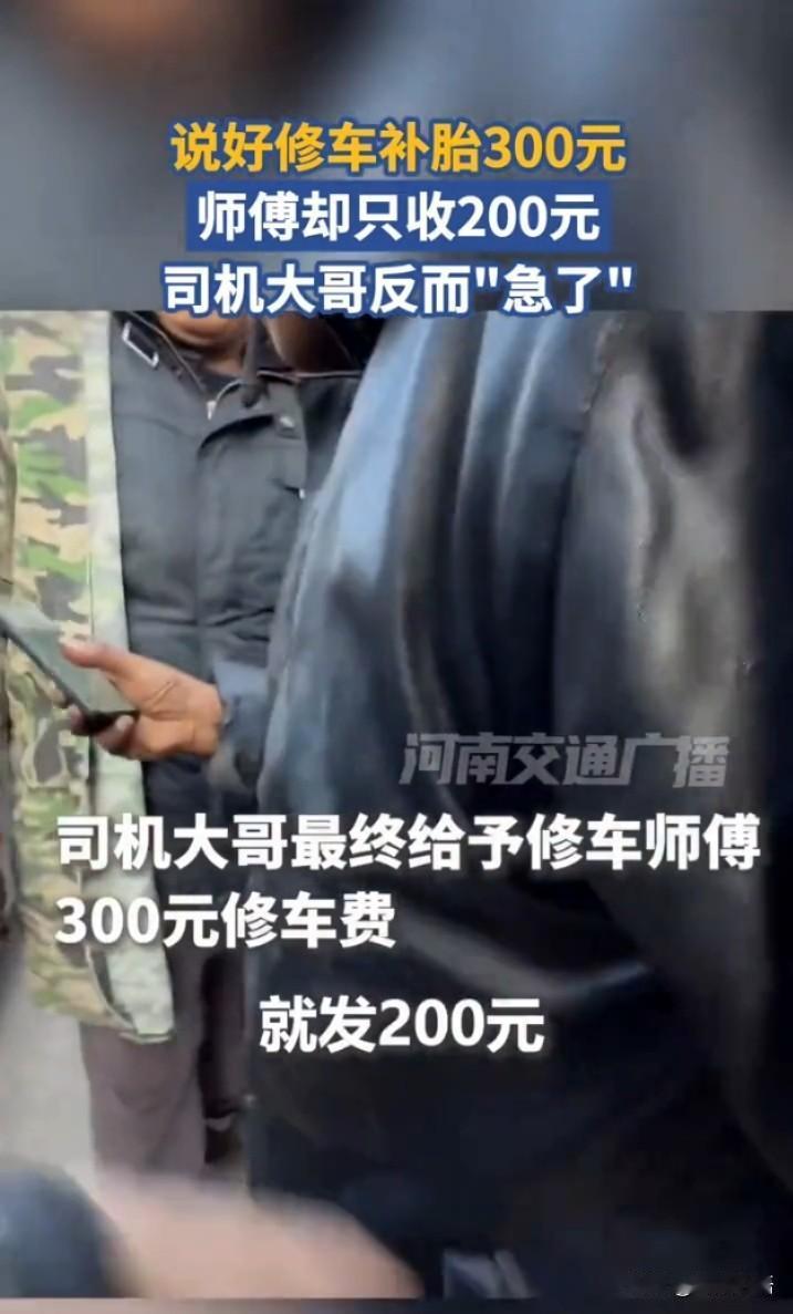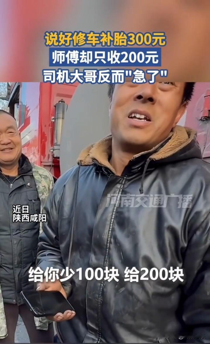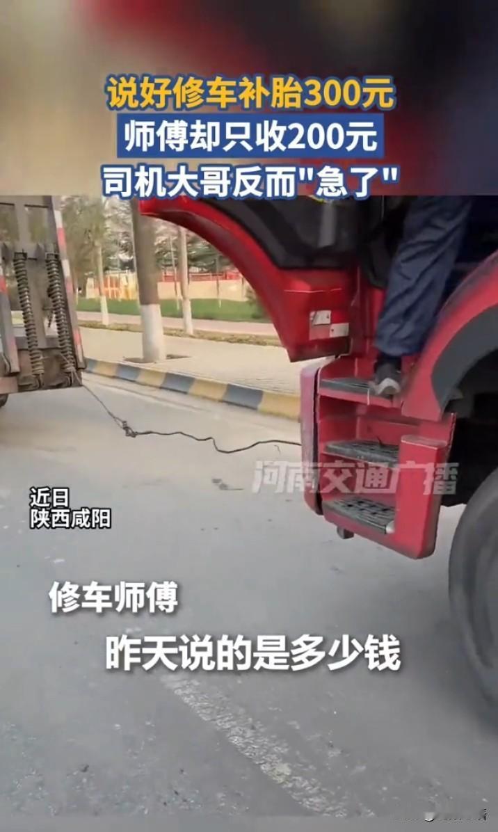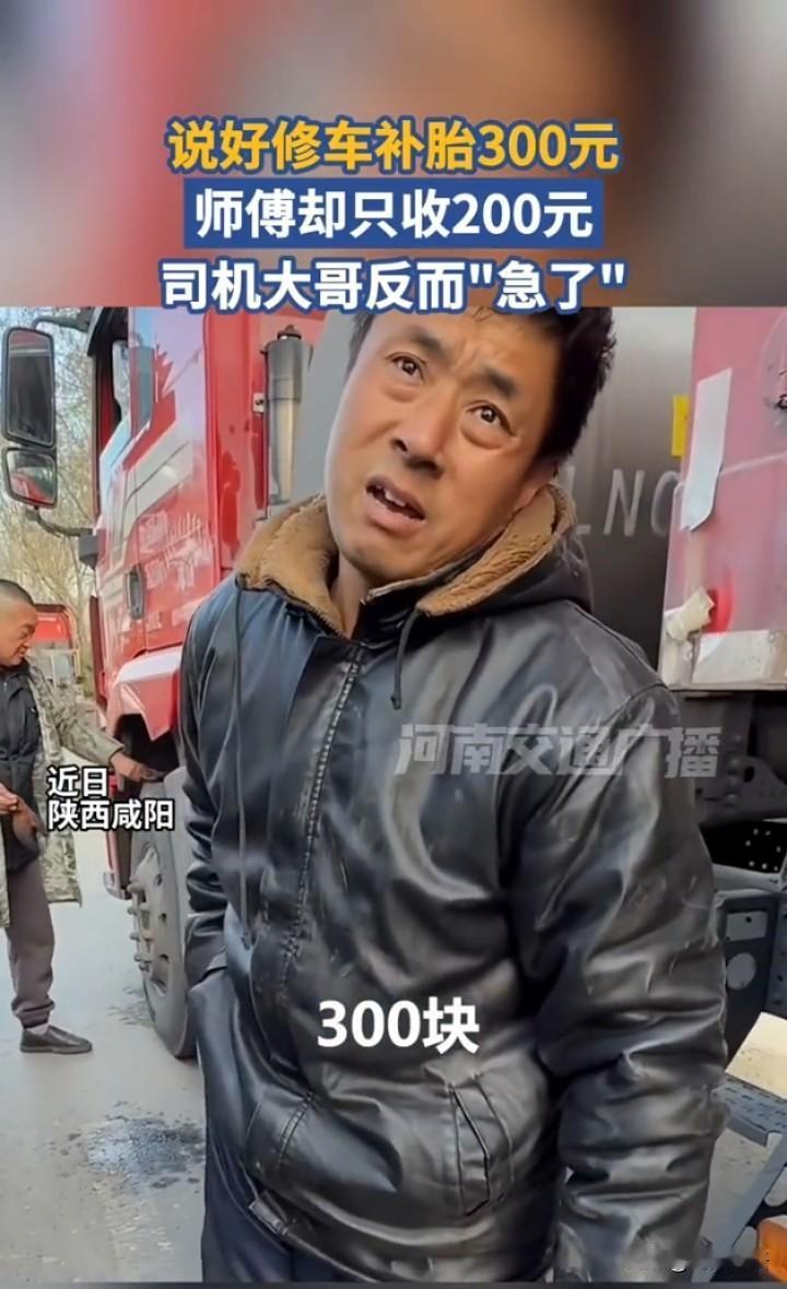 300元变200元!司机为何因“打折”急眼?一场关于诚信的暖心误会。 近日,陕西咸阳,货车爆胎,司机老张急得团团转。 荒郊野岭,行程眼看耽误。一个小伙骑车路过,主动刹停:“大哥,爆胎了?我能修!” 老张像抓住救命稻草:“能补吗?多少钱?”小伙爽快报价:“补胎充气加检查,三百块,保证弄好!” 老张心里嘀咕:这价不便宜,但总比困着强。他点头:“行!三百就三百,赶紧的!” 修车小哥二话不说,撸起袖子开干。 他动作麻利如庖丁解牛。 卸轮、扒胎、查漏、补洞、装回、打气,一气呵成。汗珠顺着他脸颊滴落。 活儿干完,小伙擦把汗,,司机问修车师傅,昨天说好三百的哈! 修车师傅却着改口:“大哥,您跑车辛苦。这活儿我干得快,收您二百吧!” 谁料,老张瞬间“炸”了! 他眉头紧锁,嗓门拔高:“啥?二百?!说好三百就三百!你这不是瞧不起人吗?” 小伙懵了,赶忙解释:“大哥,我没那意思!看您不容易,才……” “!”老张挥手打断,脸涨得通红,“难归难,该多少就多少! 你当我老张贪这点便宜?”掏出手机就要转账! 讲好的价,不能变!” 空气凝固。小伙看着转过来的三百元到账 ,眼眶微热。 他明白了:这“急眼”背后,是司机大哥的倔强尊严!三百块不是钱的事,是“诚信”二字的斤两! 可您…您这么实诚…” 老张这才缓了神色,拍拍小伙肩膀:“小伙子,手艺好,心也好。但咱跑江湖,一口唾沫一个钉!该你的,一分不能少!” 这场“误会”,暖了全网的心。 网友盛赞:这是诚信的双向奔赴! 司机守诺如山,小伙善意打折。那“急眼”的怒吼,恰是最朴素的契约精神闪光! 三百块变二百?不!是信任与尊严,在小小补胎摊前,完成了无价的交换!补胎收费 咸阳补胎换胎冬日生活打卡季 信息来源于大象新闻