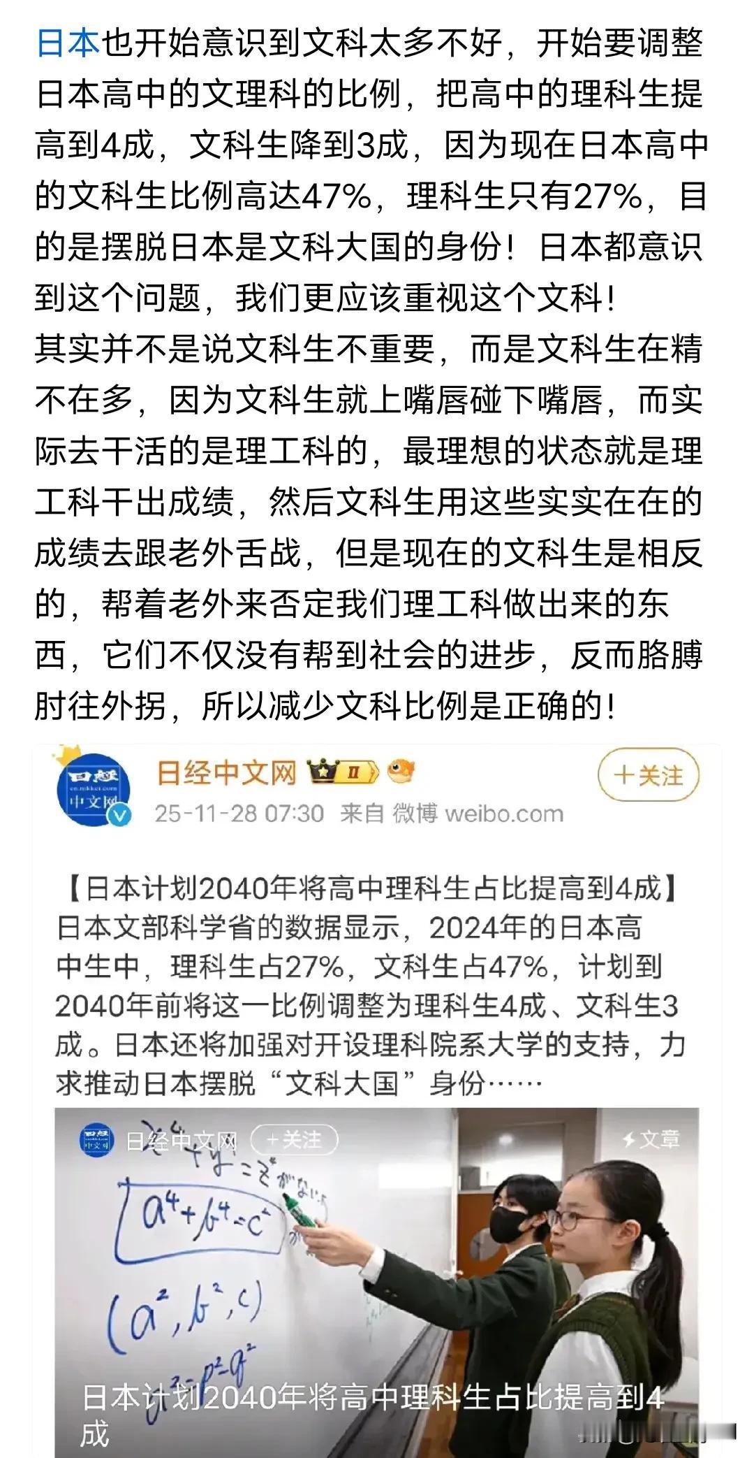 理科确实重要,但文科更重要。毛主席做的事情,就属于文科类,是指名方向的大脑,理科是被大脑指挥的手脚。我们不应该是取消文科,而是要发展正确的文科。