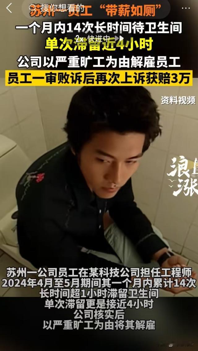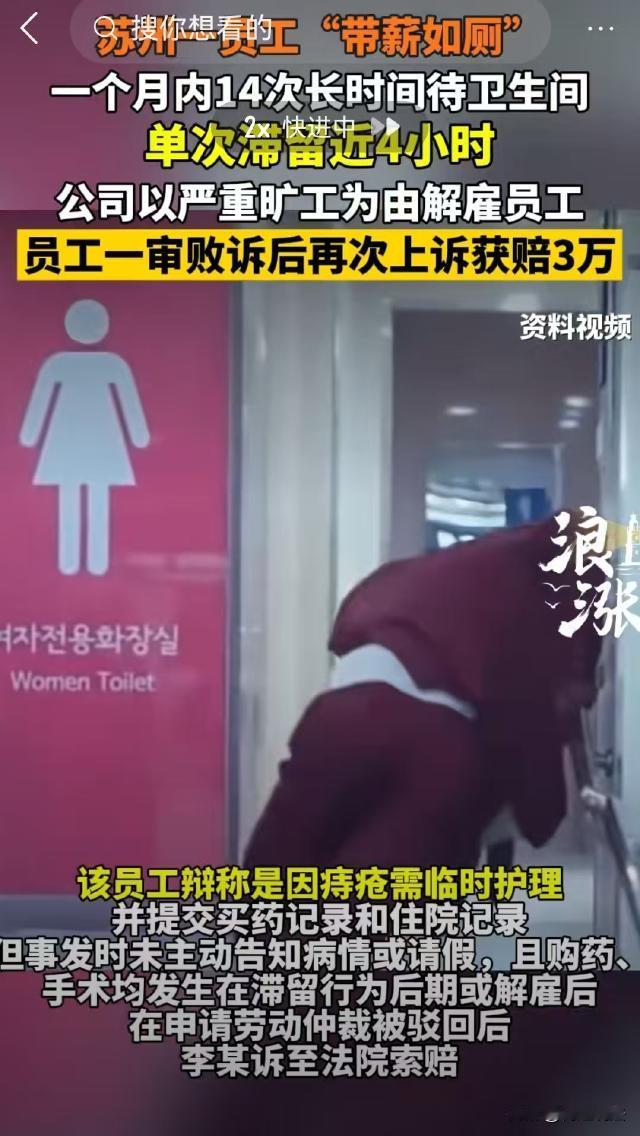 江苏苏州,男子上班期间在卫生间一待就是4小时,一个月内出现14次同样情况,公司以严重旷工为由将他解雇。男子不服,先后两次上诉,辩解称:我滞留卫生间是为了处理痔疮!并要求公司赔偿违法解除赔偿金32万余元。 据浪涨新闻、宏观新闻等报道,2010年10月,李某入职苏州某科技公司,成为了该公司的一名工程师。 2014年,李某和公司签订了无固定期限劳动合同,并签收确认了公司的员工手册。手册中明确规定,员工未经审批离开岗位一定时间视为旷工,半年内连续三次旷工视为严重违纪,公司可解除劳动合同。 就这样,李某在公司一干就是十多年,成为了一名老员工。 2024年5月的一天,领导找李某有事,同事称他上厕所了,领导给李某发信息,半天也没人回。 领导生气了,调取了办公区监控,意外发现在4月份到5月份之间,短短26个工作日内,李某一共有14次超一小时待在卫生间,单次滞留最长近4小时。 公司对此事非常重视,征得工会同意后,在履行了相应程序后,以旷工为由解除了和李某的劳动关系。 被开除后,李某申请了劳动仲裁,辩解称他有痔疮,去卫生间是因为需要临时处理痔疮问题,并提交了一系列证据。 这些证据包括2024年5月李某老婆给他买痔疮膏的记录,2024年6月和2025年1月的住院记录。 李某称,工作时间上厕所是正常人的正常生理需求,公司开除他是违法解除劳动合同。 可是,李某申请的劳动仲裁被驳回了。随后李某又将公司起诉了,要求公司支付违法解除赔偿金32万余元。 李某和公司的劳动纠纷,核心问题有两点,一是李某长时间待在卫生间是否算旷工,二是公司解除与李某的劳动合同是否合法。 1、李某在厕所一待就是四个小时,是否属于旷工? 《劳动合同法》第四条规定,用人单位应当依法建立和完善劳动规章制度,保障劳动者享有劳动权利、履行劳动义务。 本案中,公司的《员工手册》经民主程序制定,且李某已经签字,确认已知晓其中明确规定半年累计旷工3天以上可立即解雇,以及员工未经审批离开岗位一定时间视为旷工。 这意味着,该《员工手册》具有法律效力,对李某具有约束力。 据办公区监控显示,在2024年4月到5月,26个工作日内,李某有14次超一小时待在卫生间,单次滞留最长近4小时,远超合理生理需求范围。 符合《员工手册》中擅离岗位超过一定时间的定义,应认定为旷工。 从法律角度看,员工在工作期间应遵守用人单位的规章制度,李某的行为明显违反了公司关于出勤和岗位纪律的规定。 对此,李某辩解称滞留卫生间是为了处理痔疮,提交了购药记录和住院记录作为证据。 但李某事发前未主动告知病情或请假,且买药、手术均发生在滞留行为后或解雇后。 公司提供了带薪病假制度,李某完全可通过正规渠道请假,而非擅自离岗。 此外,经调查显示,2024年4月前及5月27日后,李某均无类似滞留情况。 这进一步佐证了,李某长时间滞留卫生间的行为与病情无必然关联。 李某的岗位需要随时响应工作需求,长时间失联已导致工作延误,李某的行为违反了劳动者应履行的劳动义务和职业道德,因此李某以病情为由的抗辩不成立。 2、公司解除劳动合同的程序是否合法?法院会怎么判? 《劳动合同法》第四十三条规定,用人单位单方解除劳动合同,应当事先将理由通知工会。 本案中,公司在解除与李某的劳动关系时,征得工会同意后,履行了相应程序,程序符合法律规定。 因此公司解除与李某的劳动合同是合法的。 一审认为,李某在26个工作日内,14次在卫生间滞留超过一小时,不属于正常的生理需求。 李某以痔疮为由抗辩,但买药和手术都发生在案发后,并且,他完全可以报备请假,却选择擅自离岗,延误了工作,李某的行为应当认定为旷工。 另外,公司开除李某程序合法,不存在非法解除劳动合同的情形。 最终,一审驳回了李某的诉讼请求。 一审判决后,李某不服提起上诉,二审对双方进行了调解,最终,公司同意一次性补偿李某3万元,双方和解。