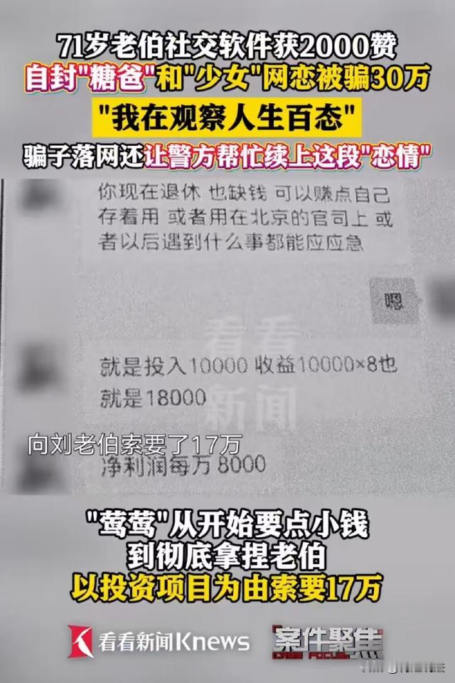 上海,71岁的刘老伯和20多岁的清纯美女网恋,还眼都不眨给小女友转17万创业,结果女友约刘老伯到公园见面时,刘老伯被其前男友劫持敲诈。事后刘老伯报了警,才得知女友就是那个劫持他的小伙子假扮的,可刘老伯不信,多次要求民警调查自己小女友的下落。检方调查得知,刘老伯多次因类似事情被骗,可刘老伯仍旧嘴硬,称:我700万的房子都留给女儿了,对得起妻女!花自己的钱干自己喜欢的事,值! 71岁的刘老伯年轻时是一名高级工程师,还兼顾某公司的顾问,手里攒下了不少积蓄。 退休后,刘老伯觉得自己辛苦了一辈子,是该享福的时候了。 于是刘老伯敲定,他名下的两套价值700万的房子留给女儿,至于退休工资,自己怎么高兴怎么花。 刘老伯常挂在嘴边的话就是:700万她们哪里花得完?我这把年纪了,对得起妻女! 于是,刘老伯自从退休后,就将全部心思放在了网络交友上,他专找年轻漂亮的姑娘聊天,将全部的精力和钱都放在了这方面。 刘老伯的账号里,加的全部都是年轻漂亮的女孩,发布的作品里,有2000多个赞,都是女孩们给他点的。 刘老伯经常向别人炫耀,还骄傲地说:我阅历丰富,现在退休了,就想过自己想过的日子,和年轻漂亮姑娘聊天,有2000多个姑娘都想和我搞对象。 2024年年初,刘老伯认识了一个年轻女孩莺莺,两人添加了联系方式。 莺莺经常给刘老伯写情诗,一开口就夸刘老伯,还经常说:您老有文化有见识。刘老伯被莺莺哄的找不着北,一高兴就给莺莺发红包转账,让她买衣服和化妆品。 对于花钱这事,刘老伯很想得开,他说:我一把年纪了,人家年轻漂亮的小姑娘愿意和我聊天,我给她花点钱怎么了。 和莺莺聊了一段时间后,莺莺说她想投资创业,刘老伯眼睛都不眨,给莺莺转了17万。 刘老伯和莺莺见面了,莺莺戴着眼镜,长相清纯漂亮,刘老伯心花怒放,和莺莺聊了两个小时的天,还花1580元请莺莺喝酒,就连旁边的服务生,都得了380元的小费。 2024年11月,莺莺约刘老伯在公园见面,刘老伯赴约后,一个自称莺莺前男友的小伙用雨伞套着一把刀,指着刘老伯让他转钱。 刘老伯吓得摔了一跤,乖乖给小伙转了钱。 可小伙不罢休,又将他劫持到了宾馆,让他找女儿继续要钱。好在刘老伯的女儿看出这是个骗局没给钱,最后小伙不得已将刘老伯放了。 刘老伯回家后报了警,小伙郑某被抓获。 原来,郑某是酒吧的酒保,见识到很多有钱男人为美女一掷千金,便冒充女孩搞诈骗。 至于那个和刘老伯见面的女孩,是郑某找驻唱歌手假扮的,那个服务员就是郑某自己。 案发后,郑某因敲诈勒索罪获刑6年3个月,可是刘老伯却不信,非要检方帮他找小女友“莺莺”。 更离谱的是,工作人员了解到,刘老伯因为这种事已经被骗多次了,可工作人员劝刘老伯,他还嘴硬说:我这是花自己的钱干自己喜欢的事,值! 那么,本案从法律角度应该如何认定? 1、刘老伯和年轻女孩聊天,还经常给她们发红包转账,刘老伯是否如他所说,自己的钱想怎么花就怎么花呢? 从法律层面来看,刘老伯有权处置自己的财产。 《民法典》第二百四十条规定,所有权人对自己的不动产或者动产,依法享有占有、使用、收益和处分的权利。 刘老伯的财产属于他的合法财产,他将退休工资按照自己的意愿支配,也是在行使对个人财产的使用和处分权利。 但是,值得注意的是,刘老伯还有妻子,他未经妻子同意,将大额财产转给外面的小女友,侵害了妻子的合法权益。 《民法典》第一千零六十二条指出,夫妻在婚姻关系存续期间所得的财产,一般属于夫妻共同财产,夫妻对共同财产有平等的处理权。 刘老伯的退休工资属于夫妻共同财产,刘老伯在未与妻子协商取得一致意见的情况下擅自将钱转给她人,损害了妻子的利益。 但如果刘老伯花钱是为了满足家庭日常生活需要,依据《民法典》相关司法解释,这种情况下实施的民事法律行为是有效的,不构成对妻子利益的损害。 2、郑某冒充年轻女子莺莺和刘老伯网恋的行为应该如何认定? 郑某编造莺莺的假身份与刘老伯进行网络交友,并通过写情诗、夸赞等方式获取刘老伯的信任,骗取刘老伯17万用于所谓的创业投资,这种行为符合诈骗罪的构成要件。 根据《刑法》第二百六十六条规定,诈骗公私财物,数额较大的,处三年以下有期徒刑、拘役或者管制,并处或者单处罚金;数额巨大或者有其他严重情节的,处三年以上十年以下有期徒刑,并处罚金。 郑某以非法占有为目的,虚构事实、隐瞒真相,使刘老伯产生错误认识并处分财产,其行为构成诈骗罪,且诈骗金额17万属于数额巨大。 2024年11月,郑某以莺莺前男友的身份,用雨伞套着刀威胁刘老伯转钱,并将其劫持到宾馆继续索要钱财,这种行为构成敲诈勒索罪。 最终,郑某因敲诈勒索罪和诈骗罪两罪获刑6年3个月,并处罚金9万元。 来源:看看新闻